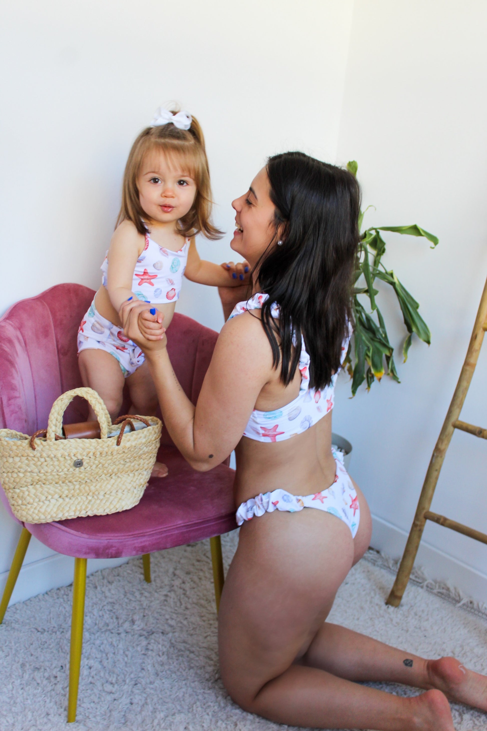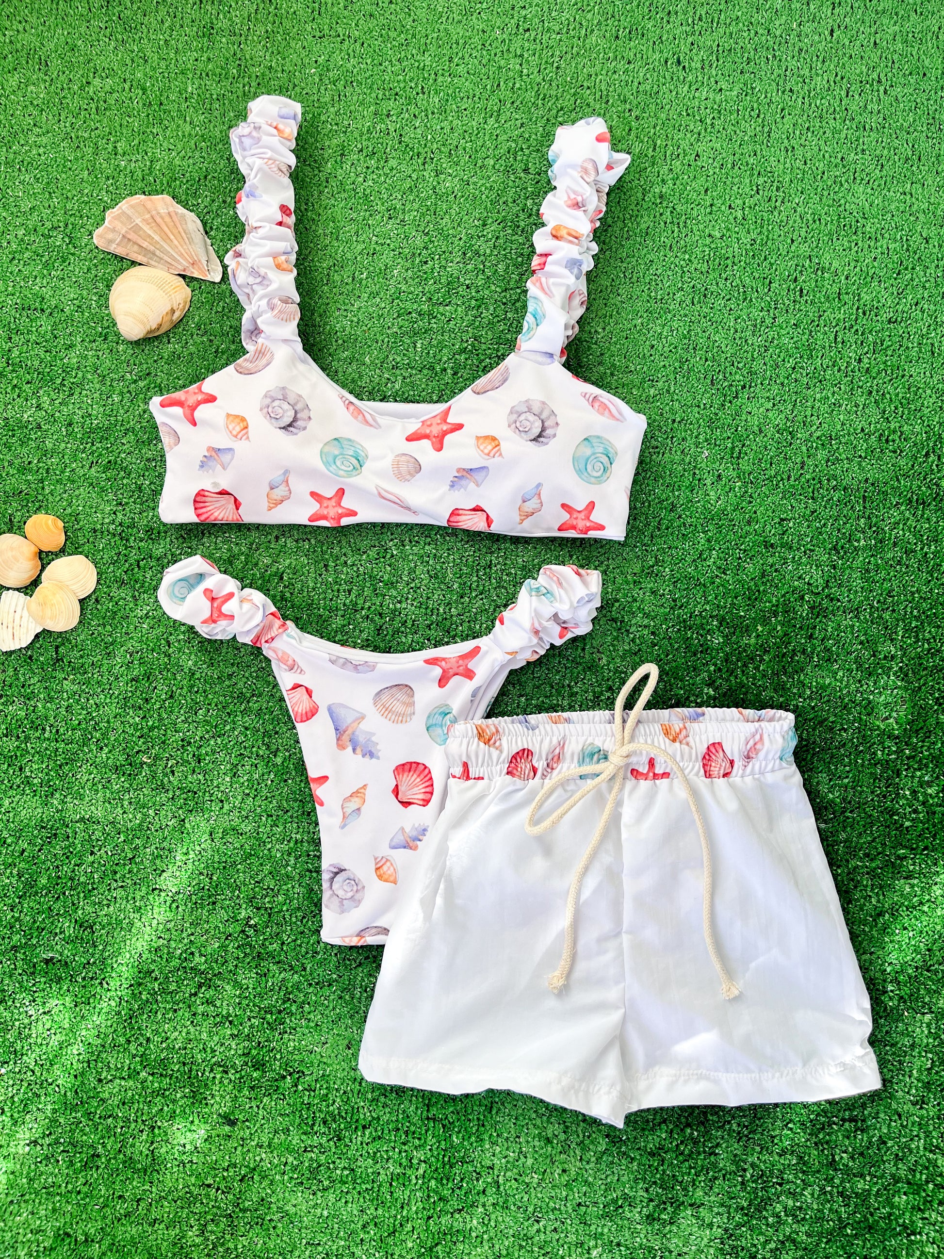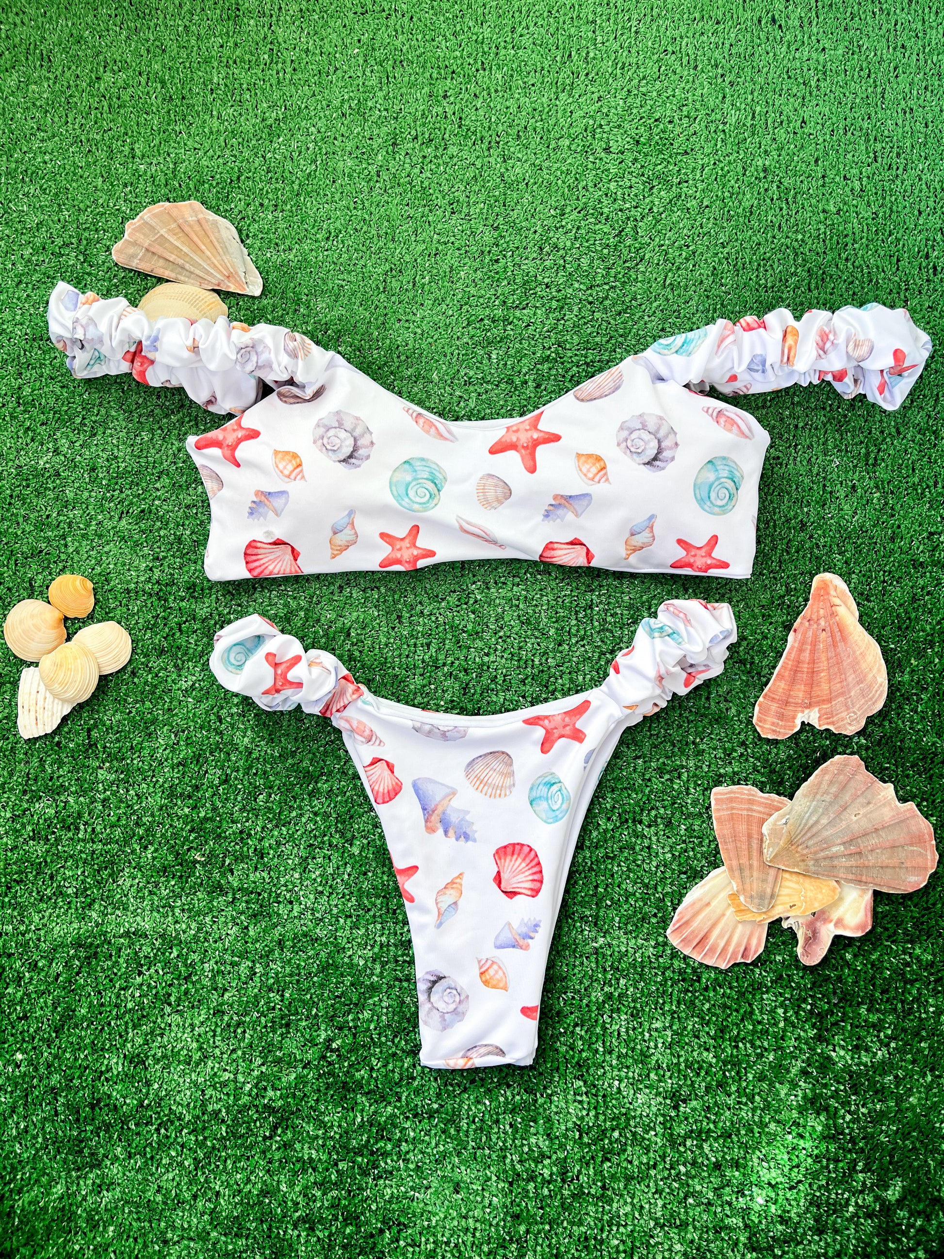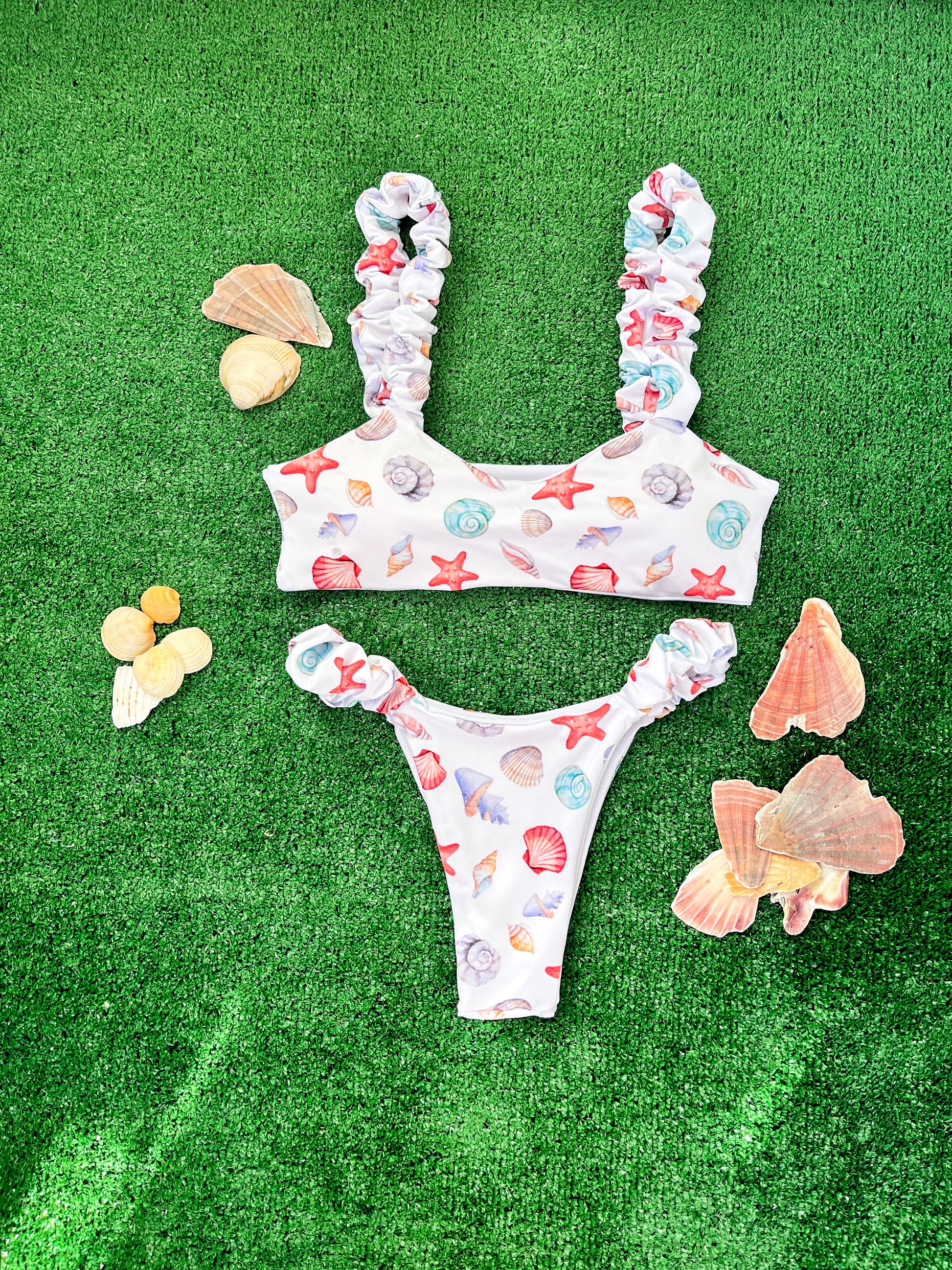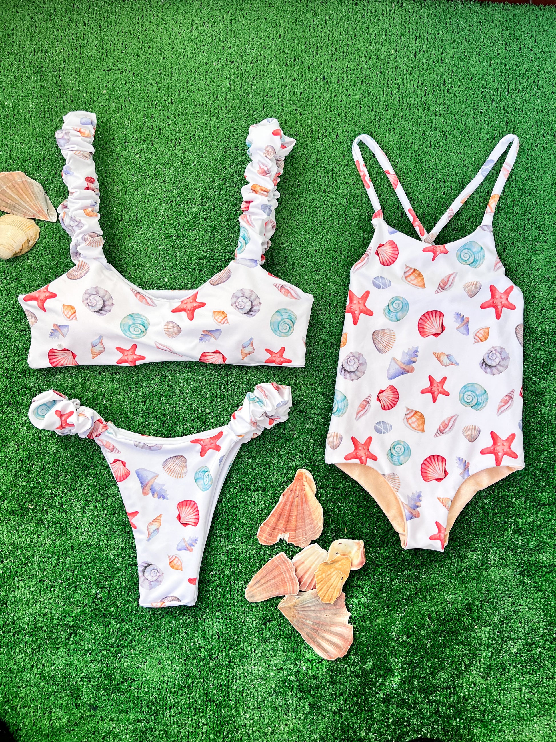 Biquíni para adulto com franzido grosso na lateral da cueca e alças da parte de cima, criando um folho com elástico interior.