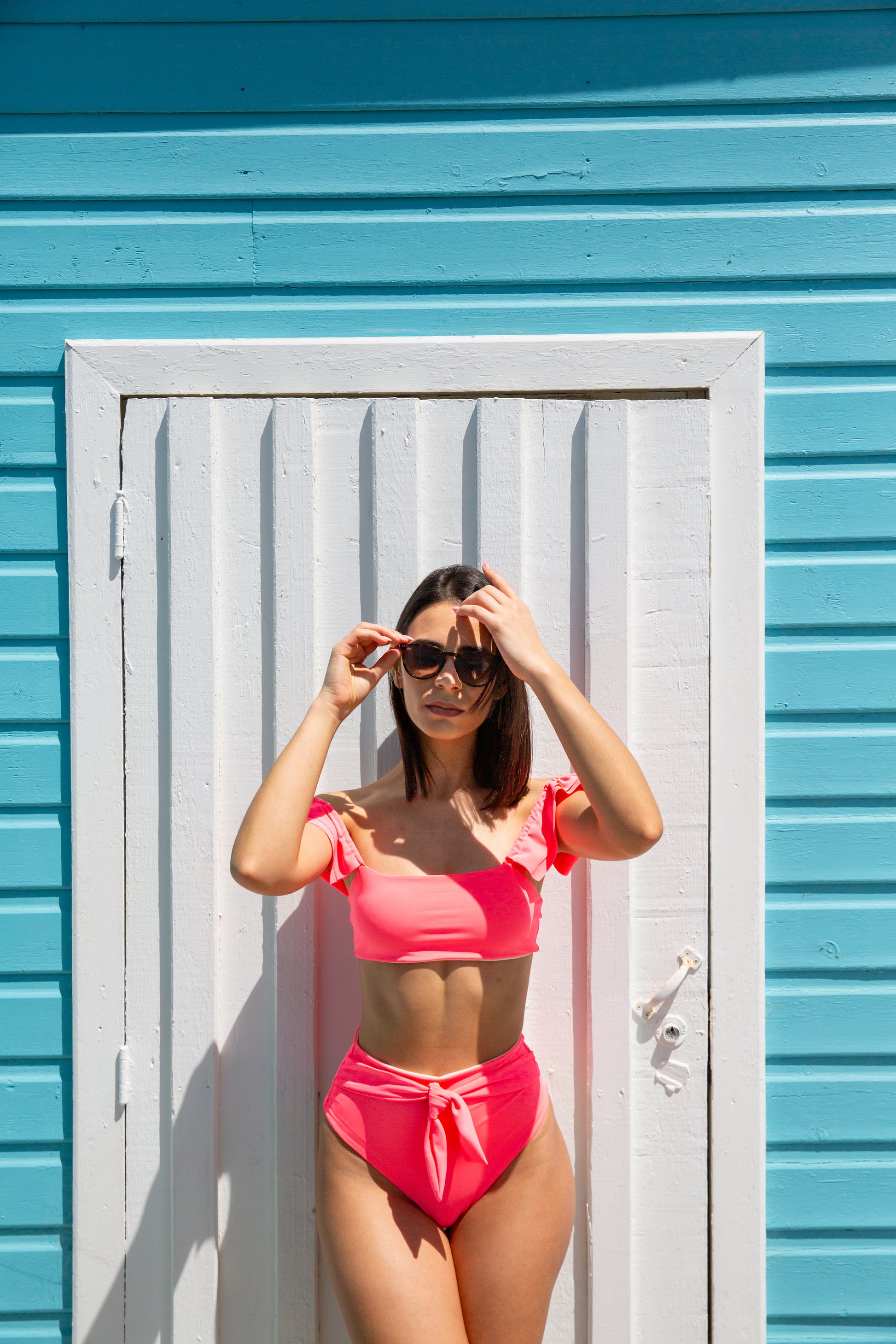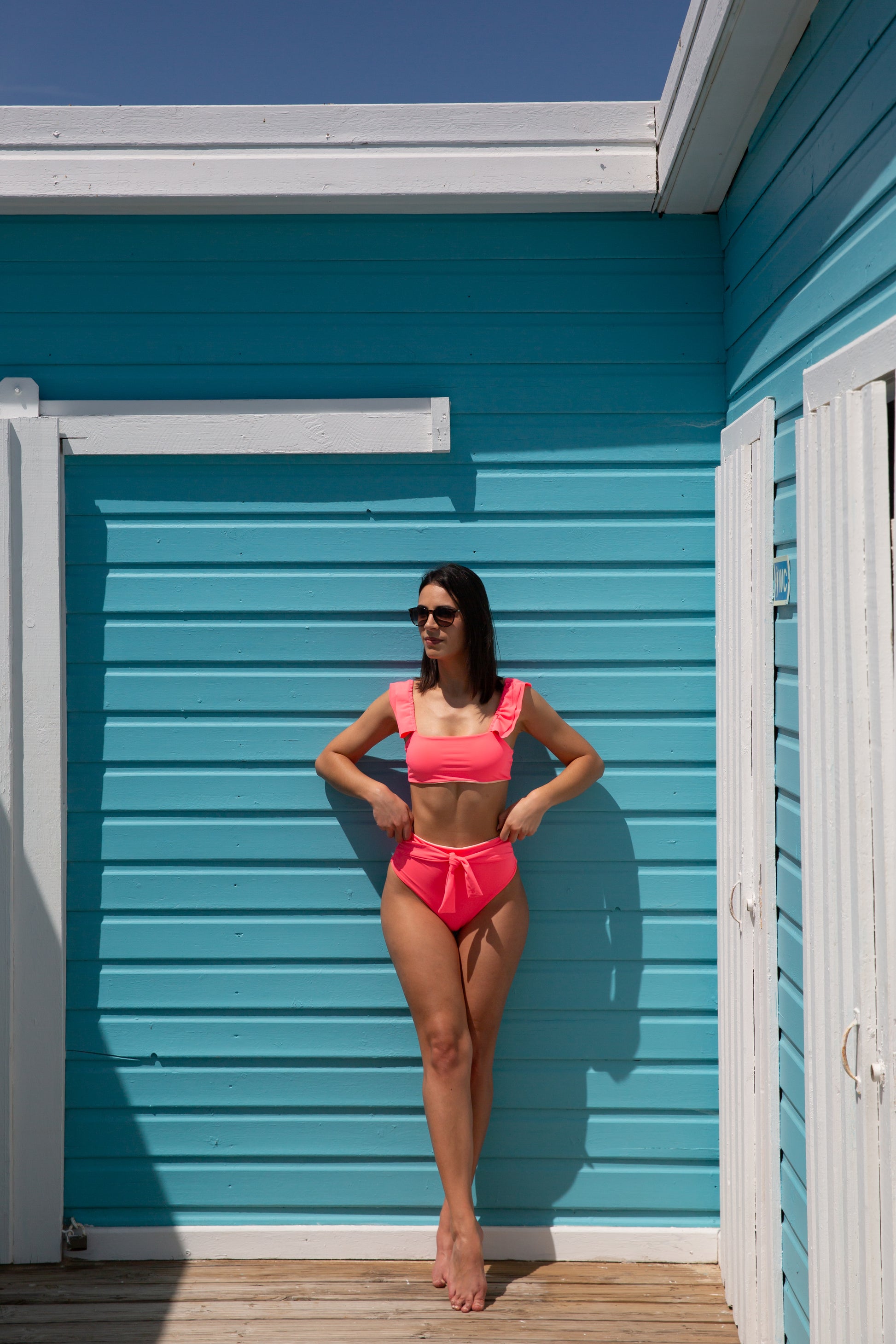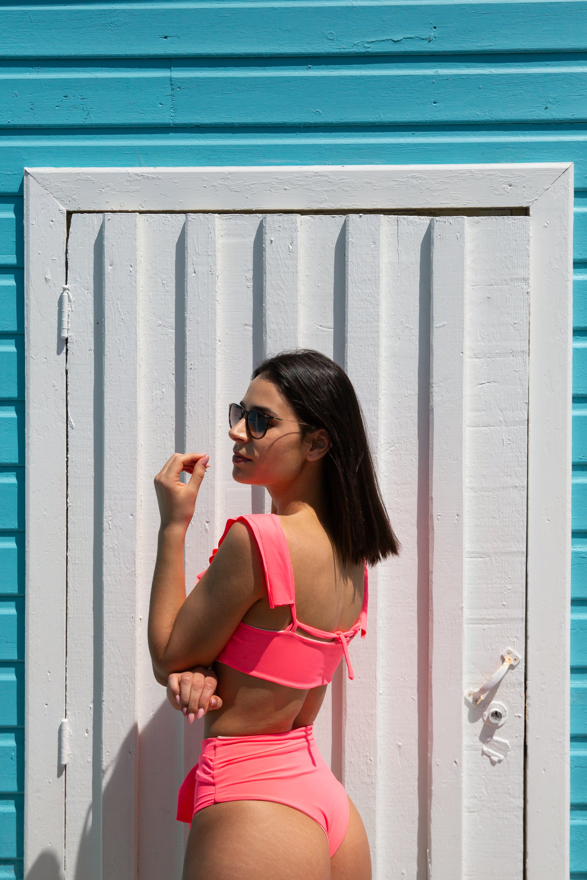 Biquíni rosa choque com laço na cueca e folhos nas alças amovíveis.