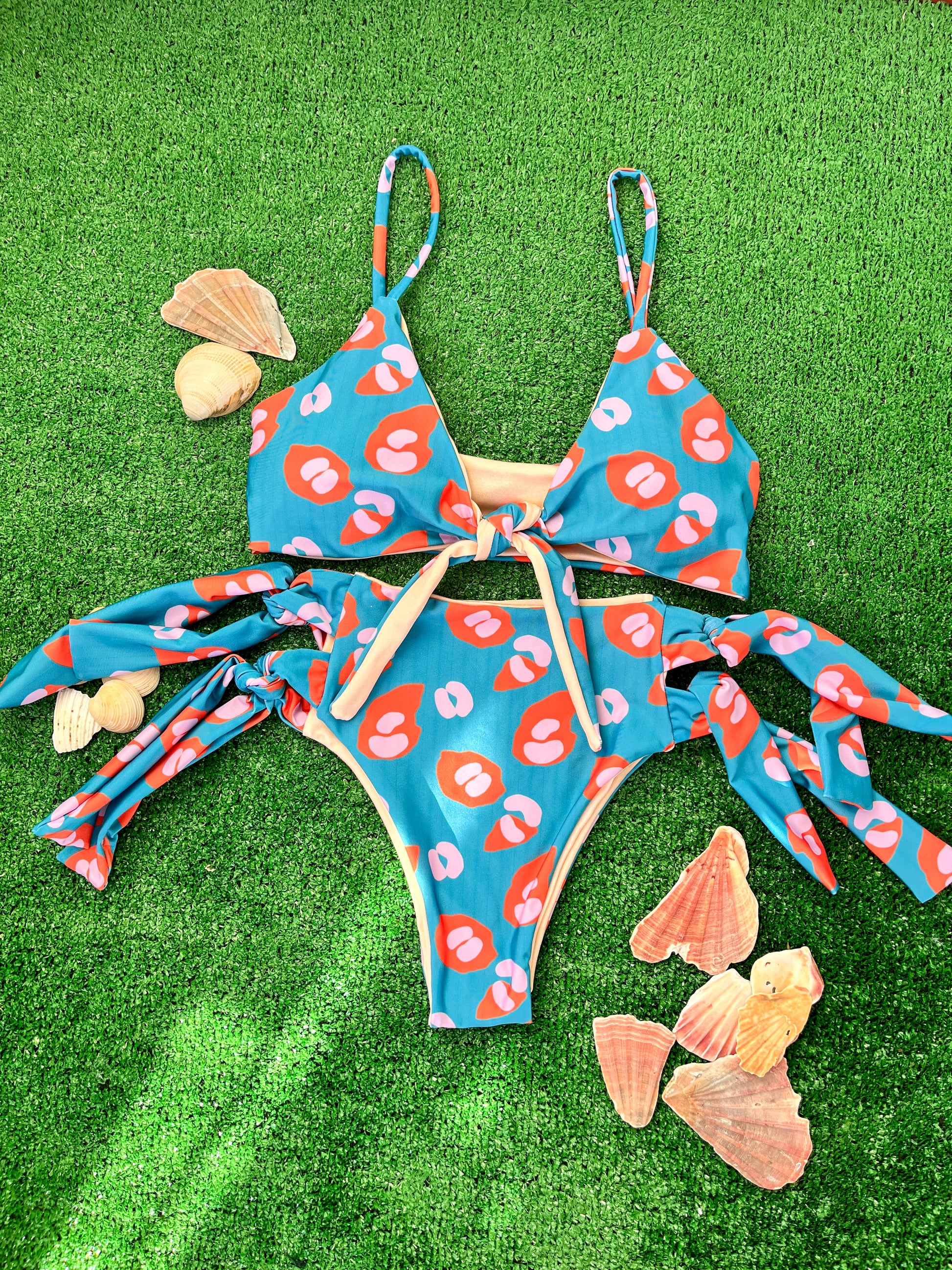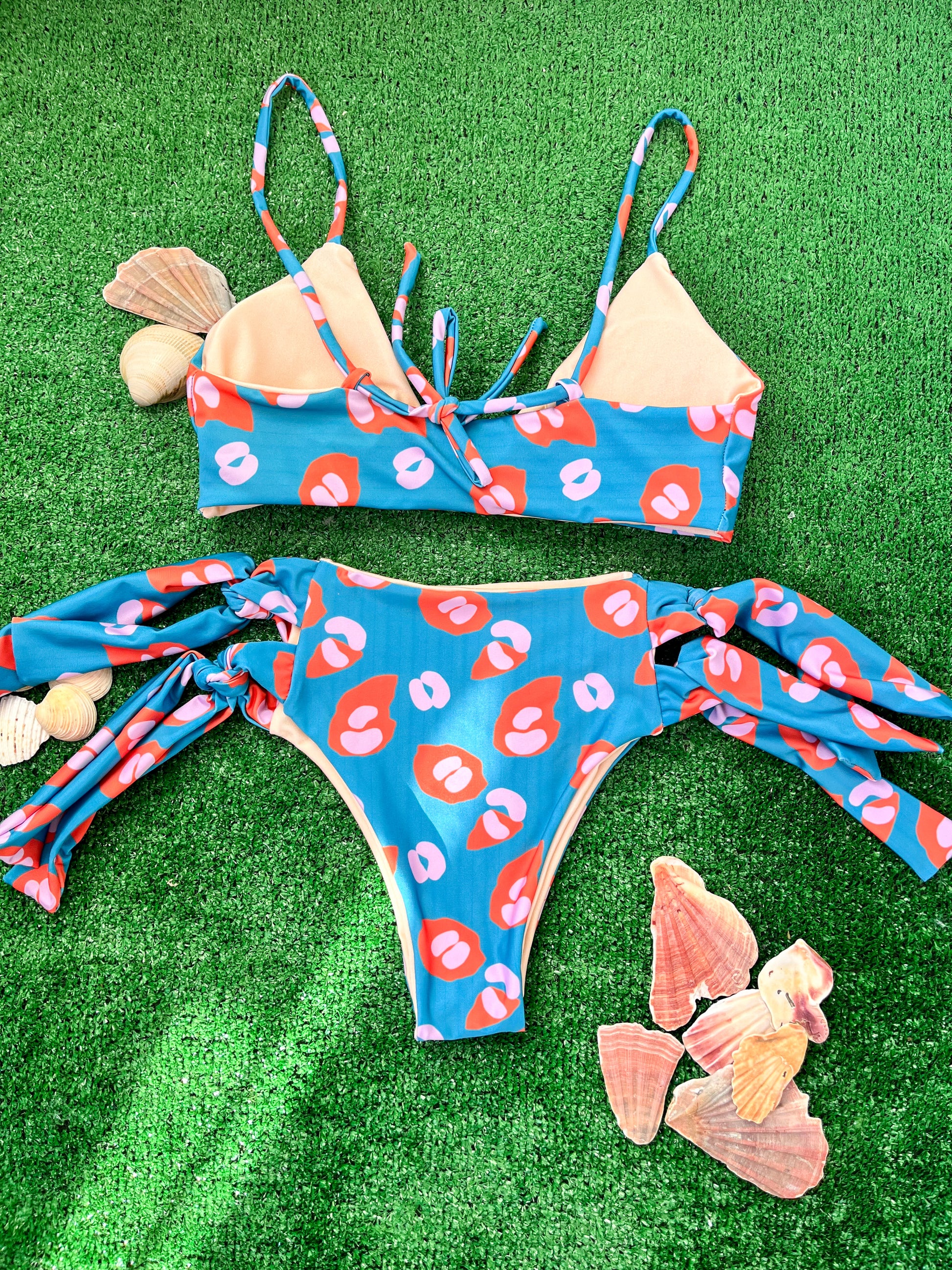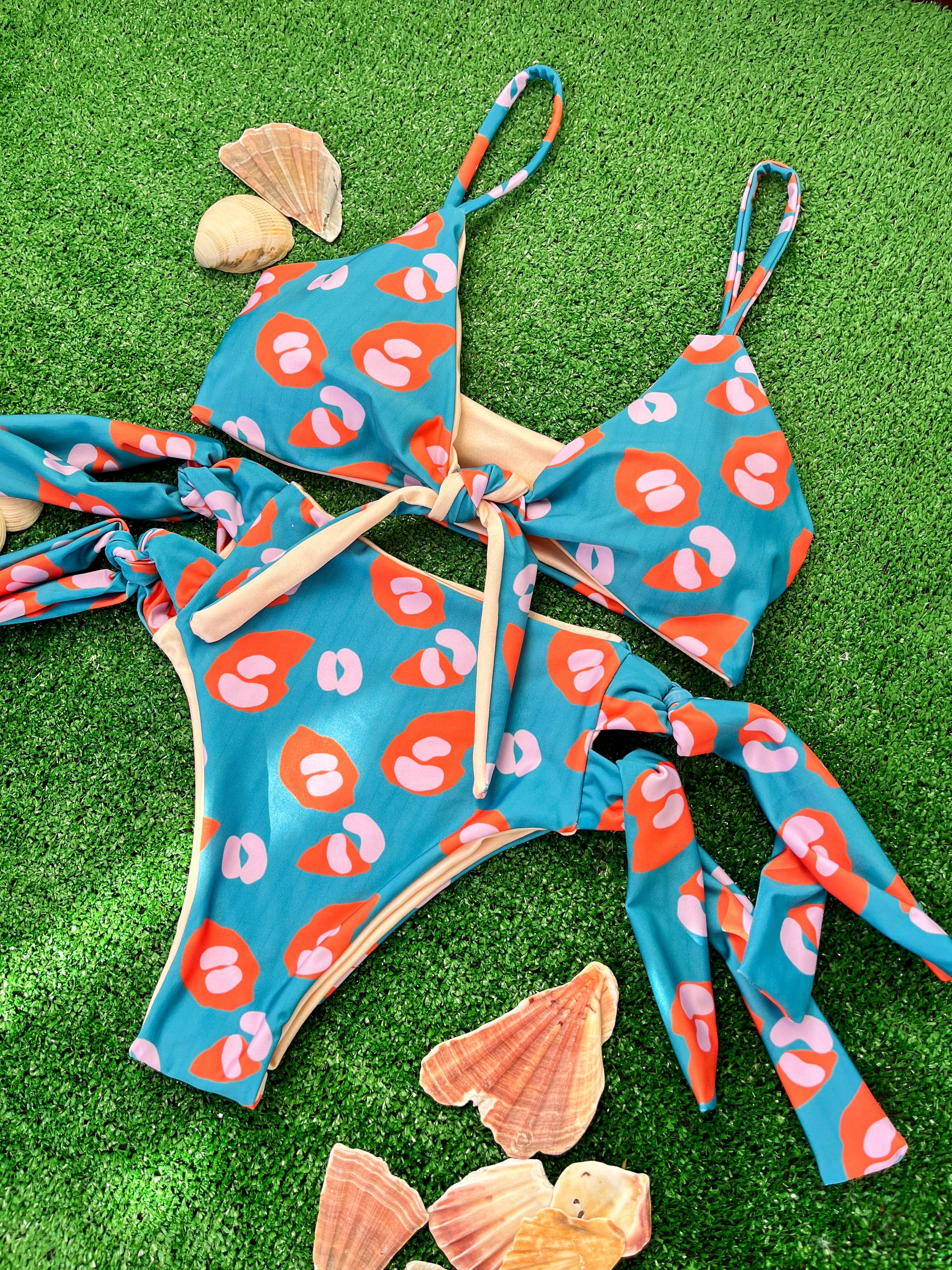Biquíni com parte de cima com laço central regulável e parte de baixo subida com tira de no duplas laterais.