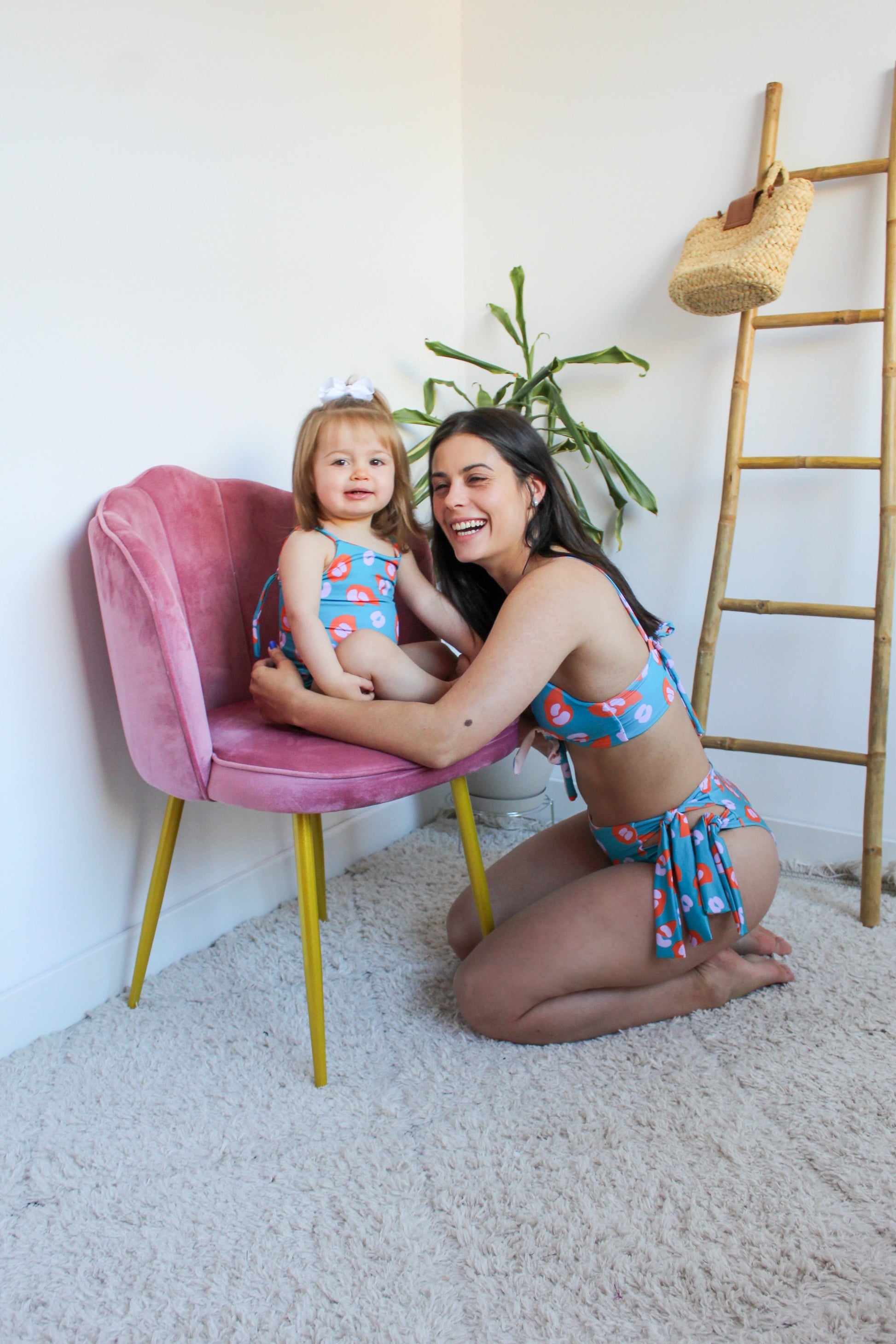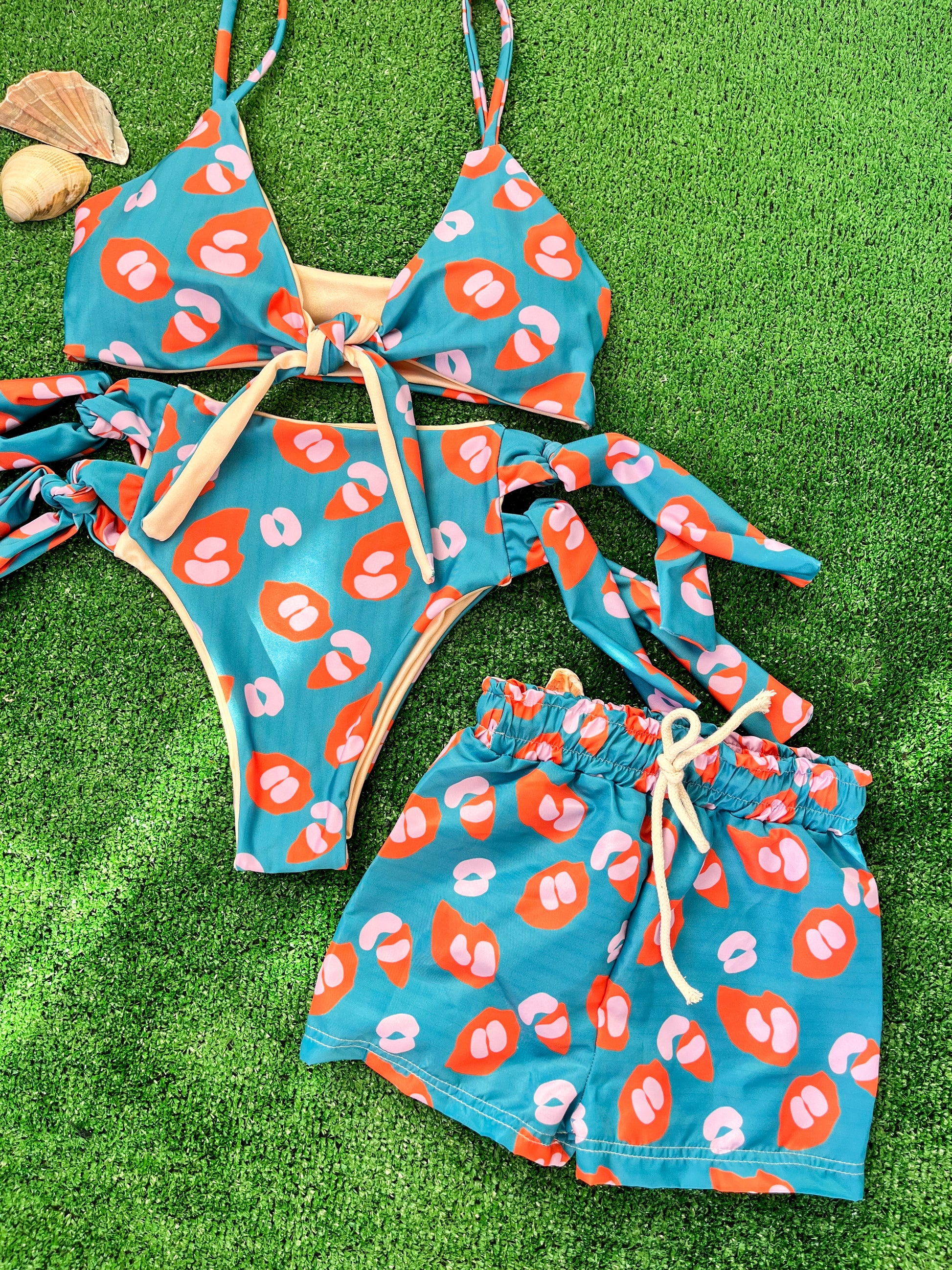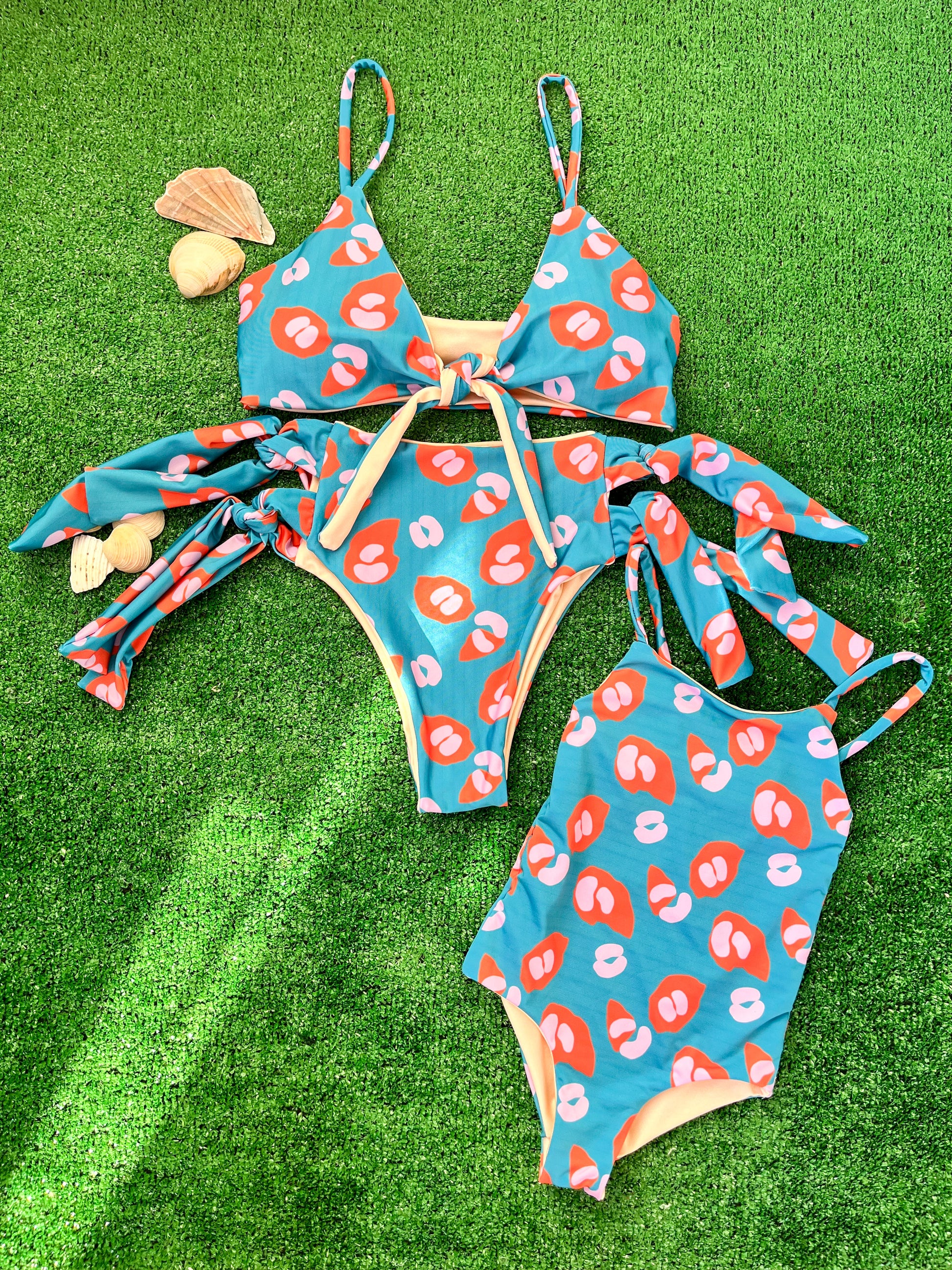 Biquíni com parte de cima com laço central regulável e parte de baixo subida com tira de no duplas laterais.