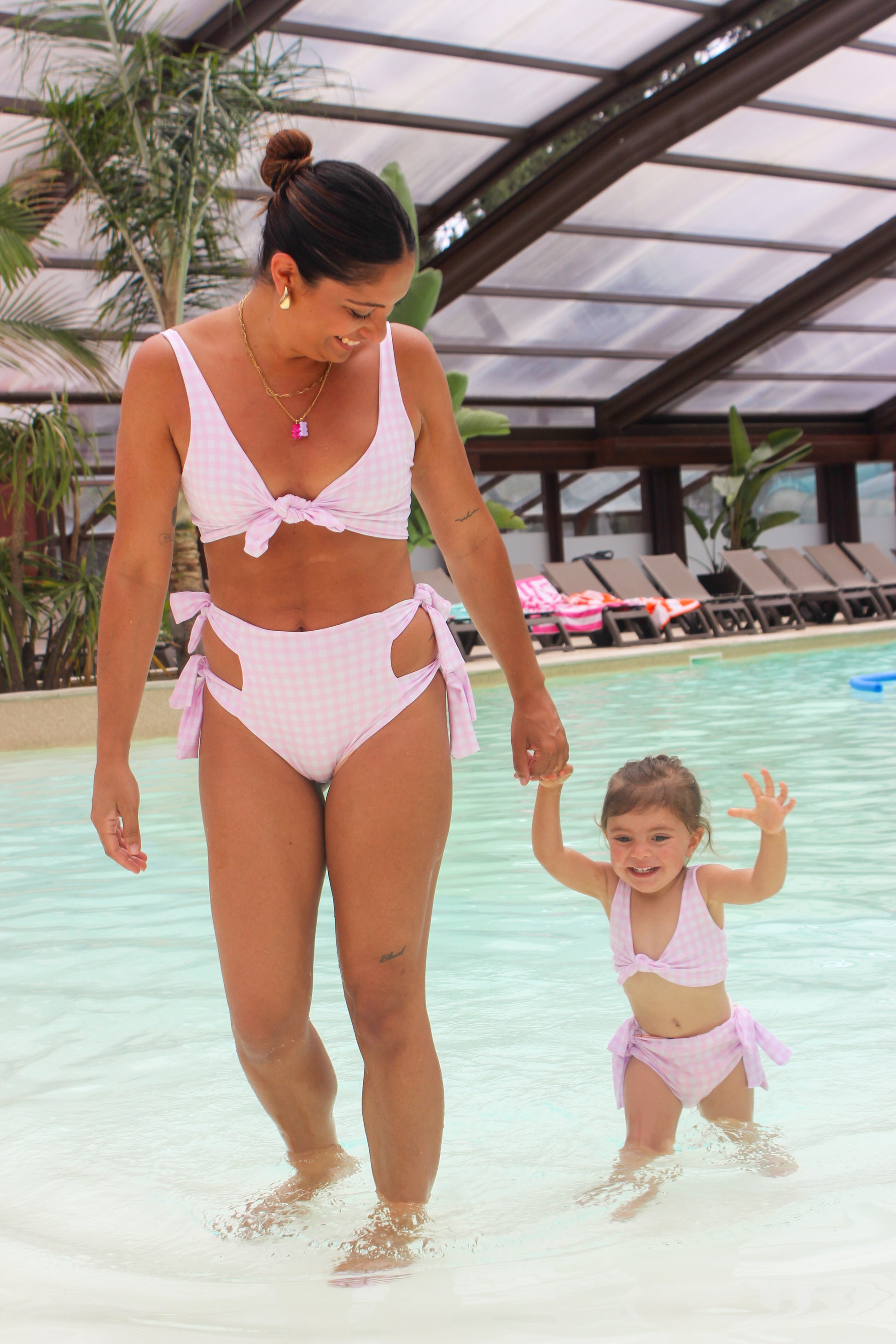 Biquíni vichy rosa claro com laços laterais na cueca e laço central na parte de cima