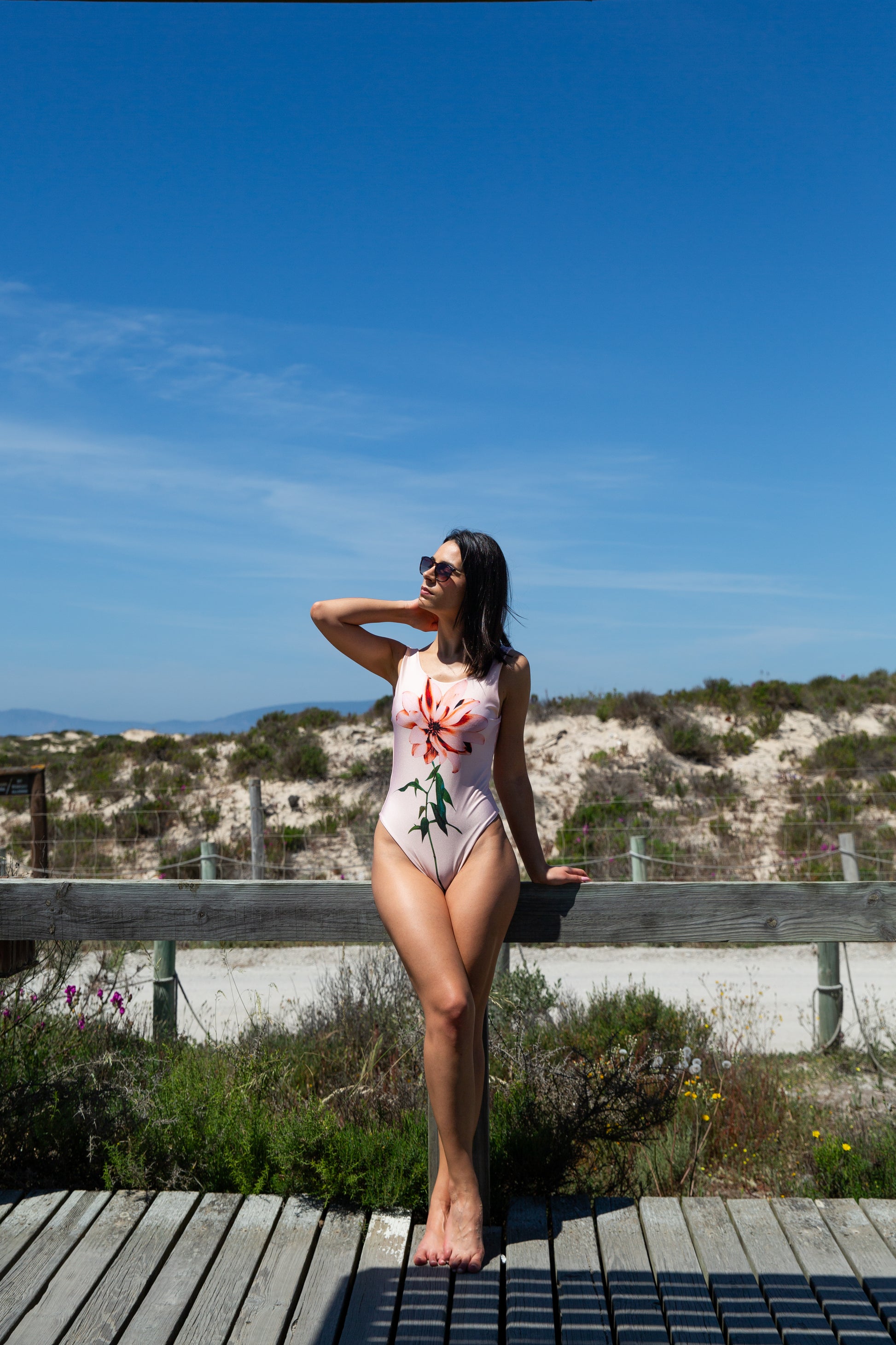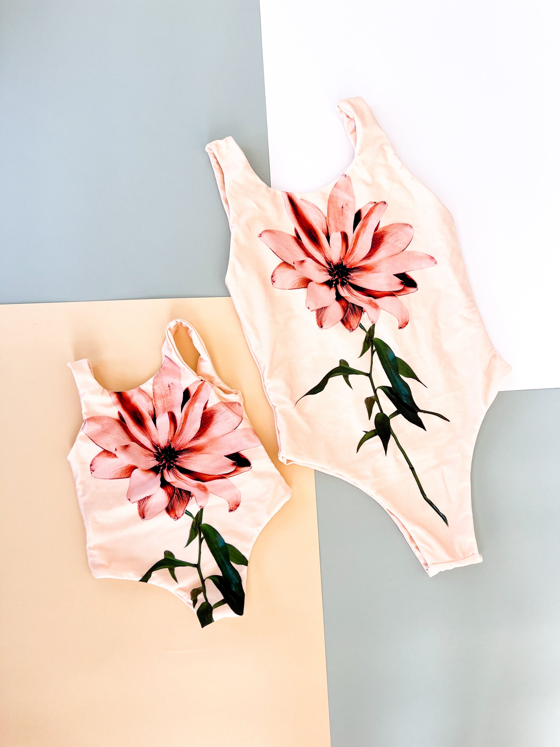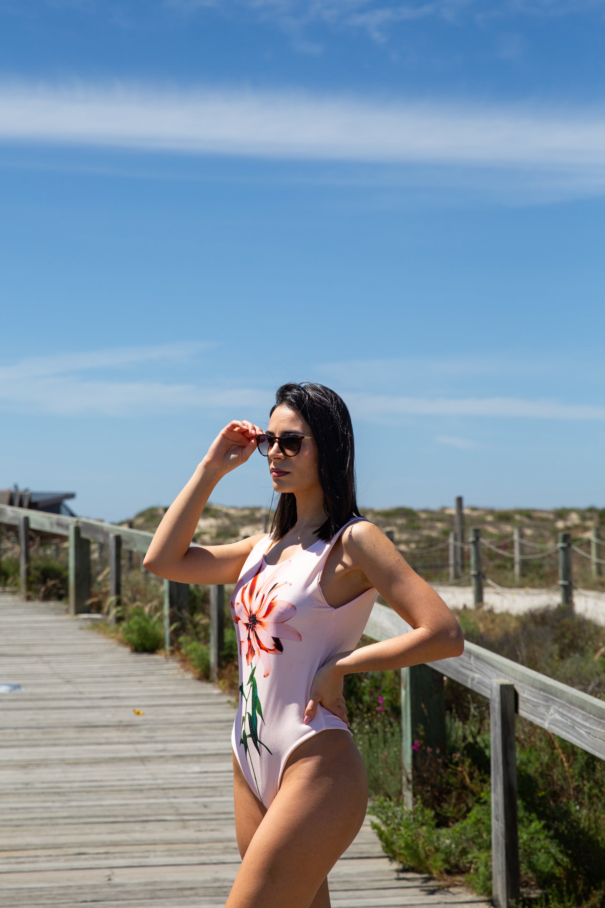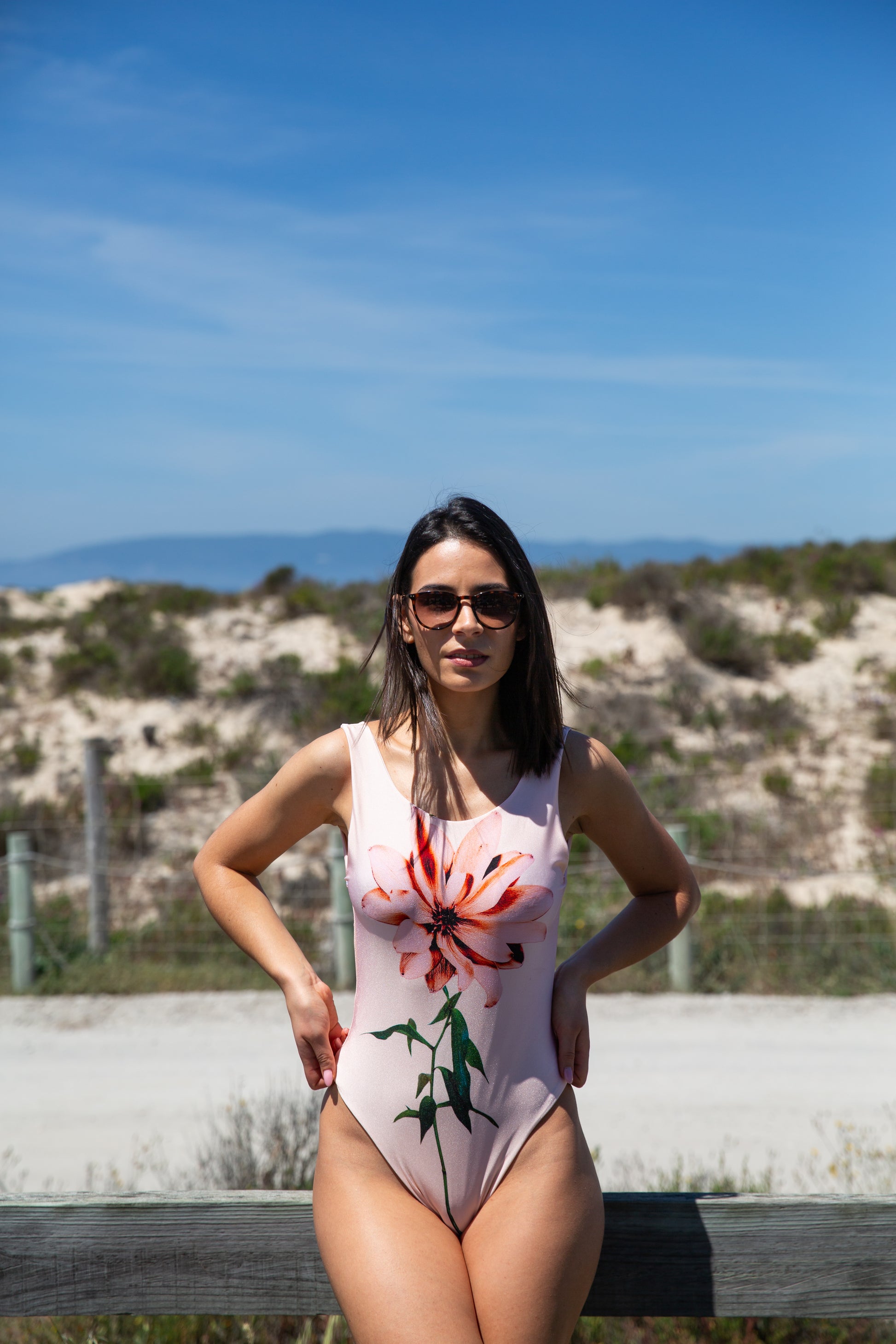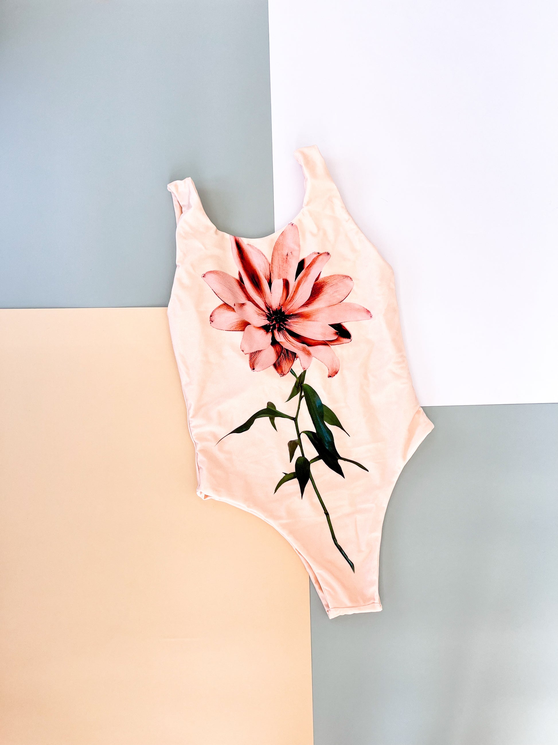 Fato de banho bege nude com ligeiro brilho e flor grande na parte da frente