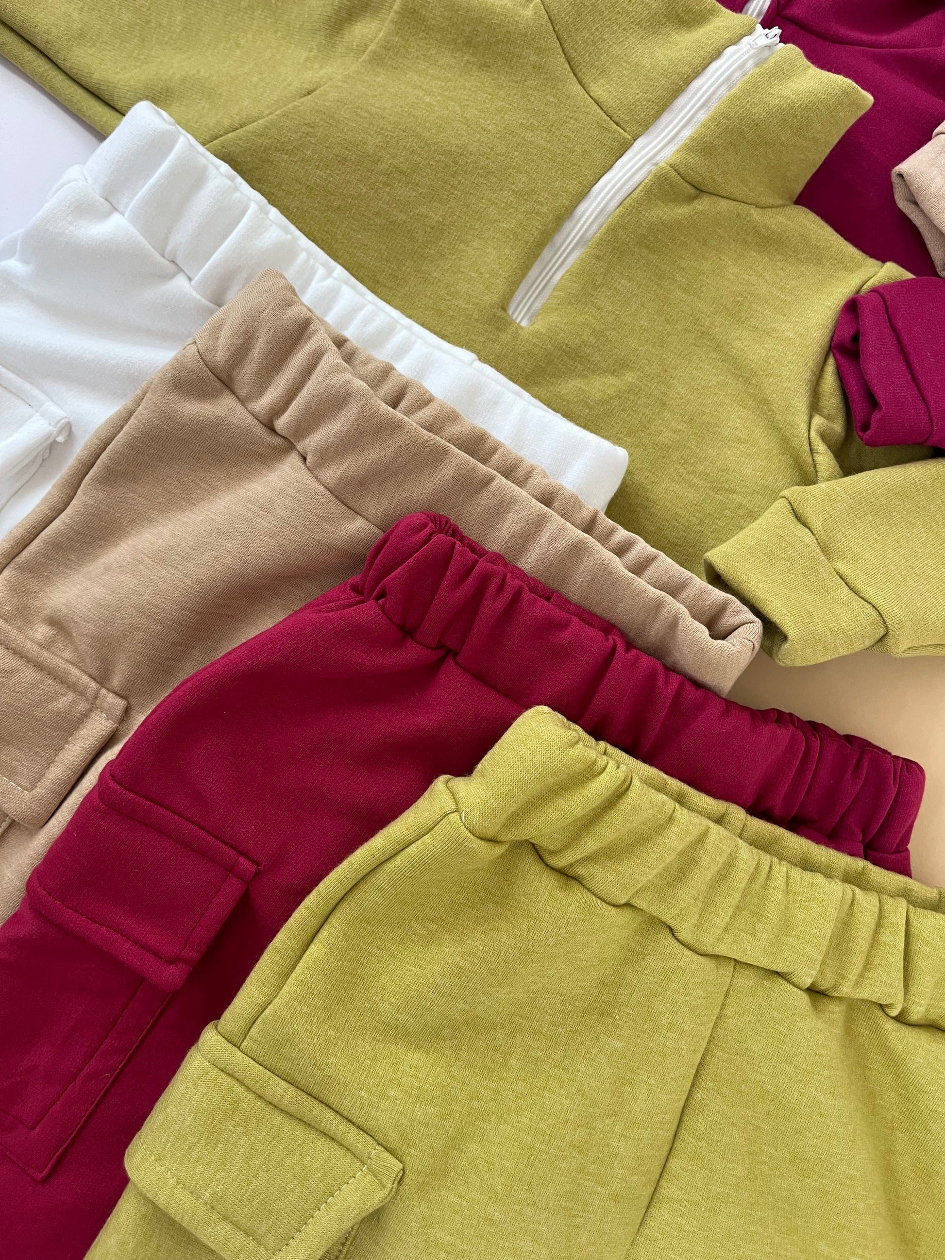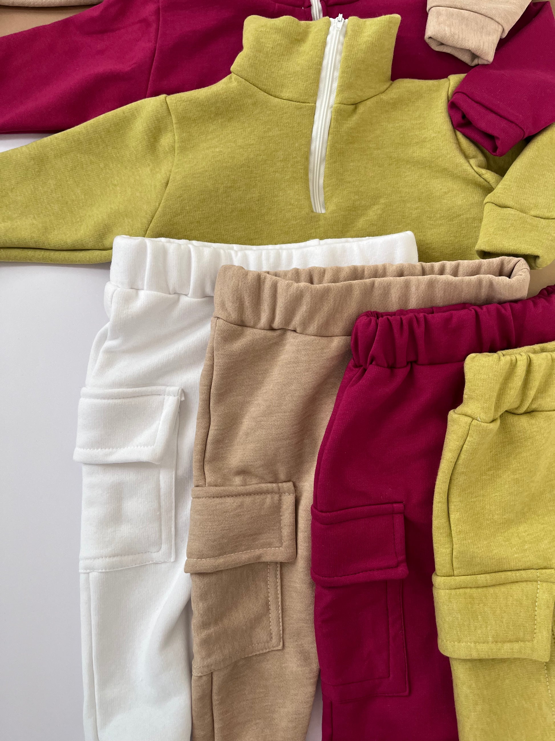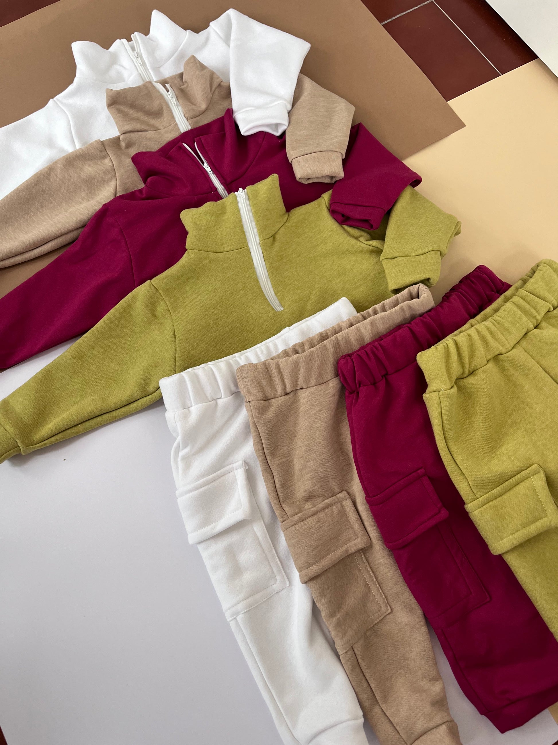 Fato de treino bebé/criança e adulto com gola alta com fecho e calças com bolsos chapados laterais.