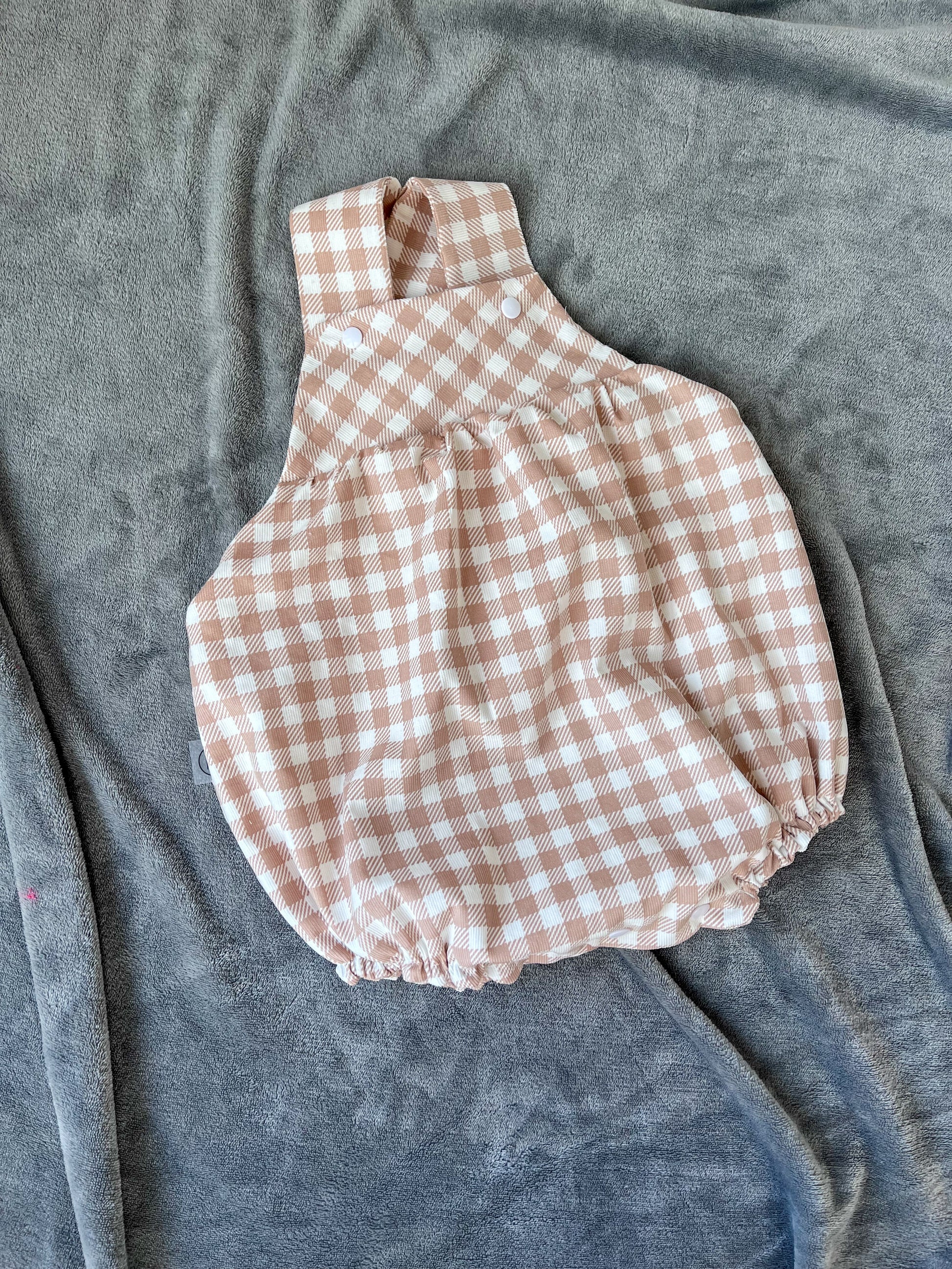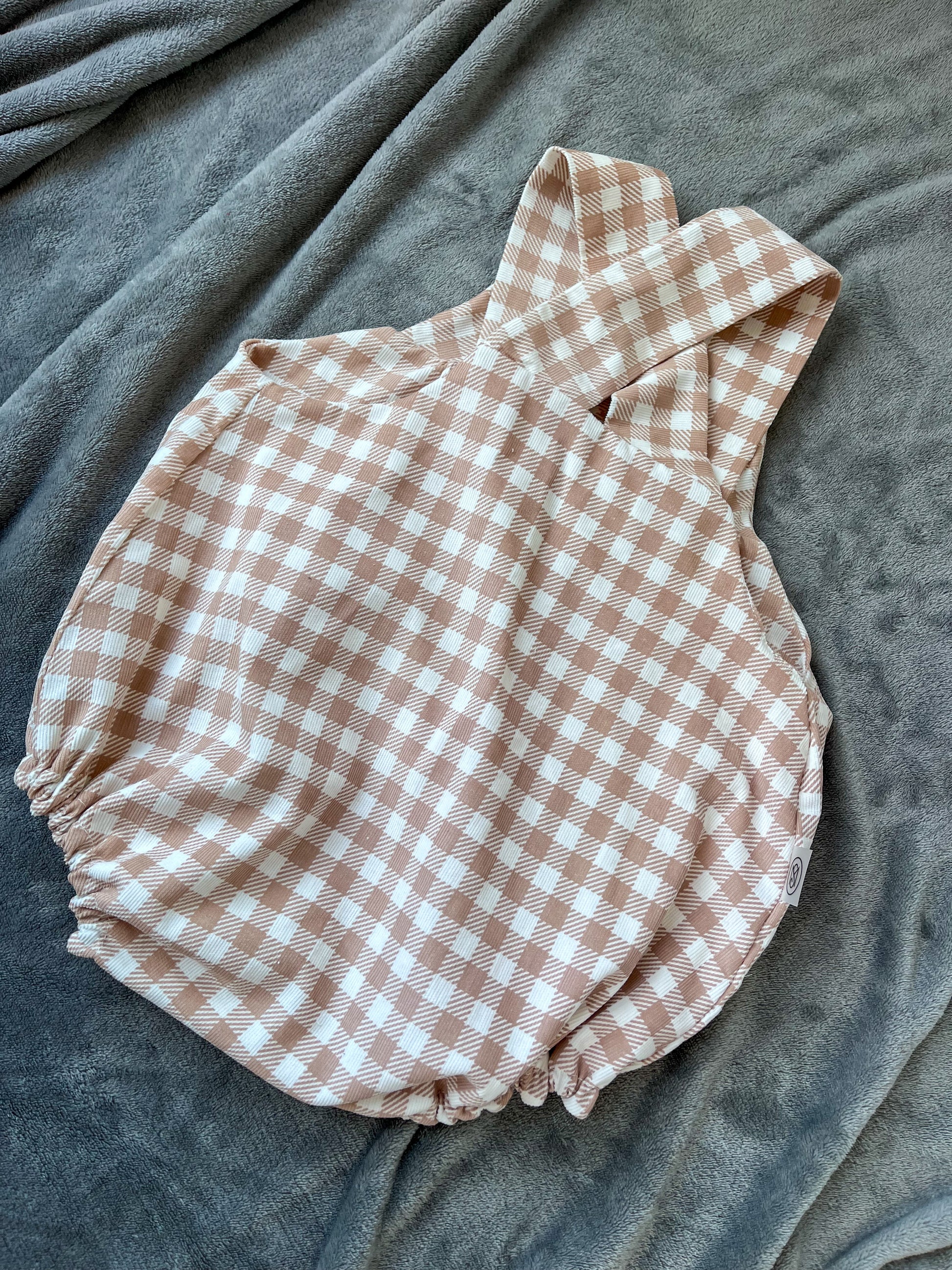Fofo unissexo com padrão tartan xadrez branco e bege, fecha nas alças e em baixo com molas.