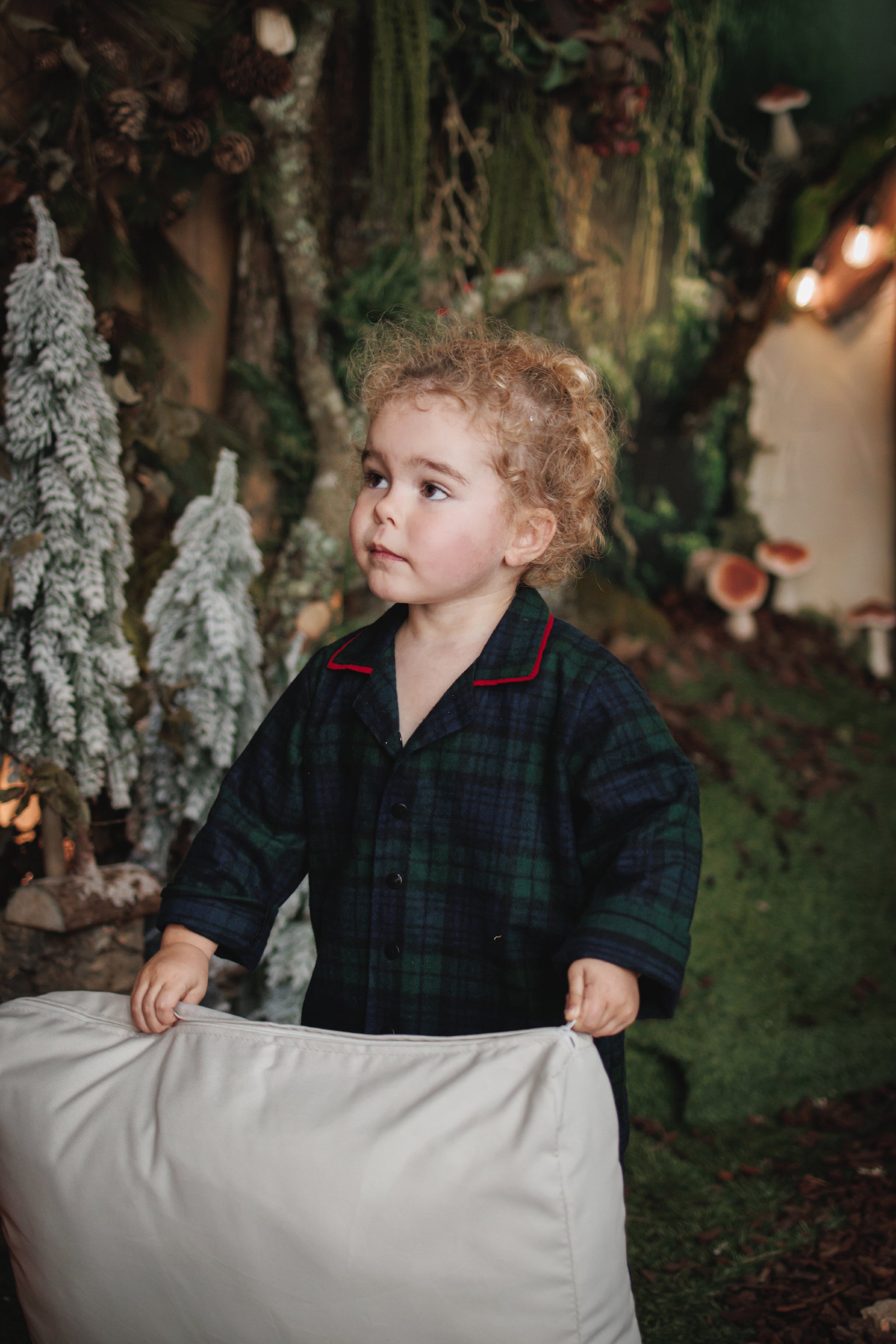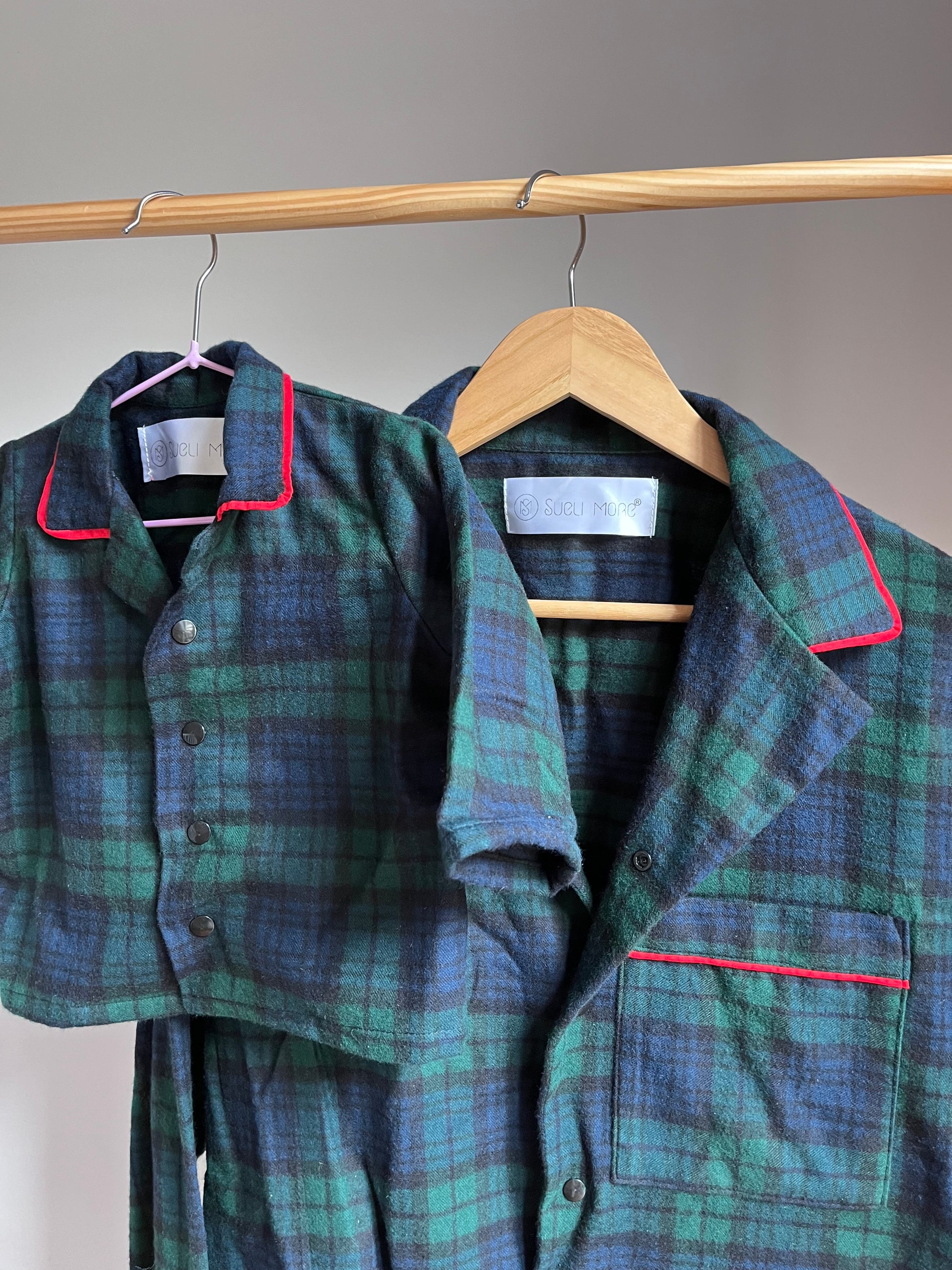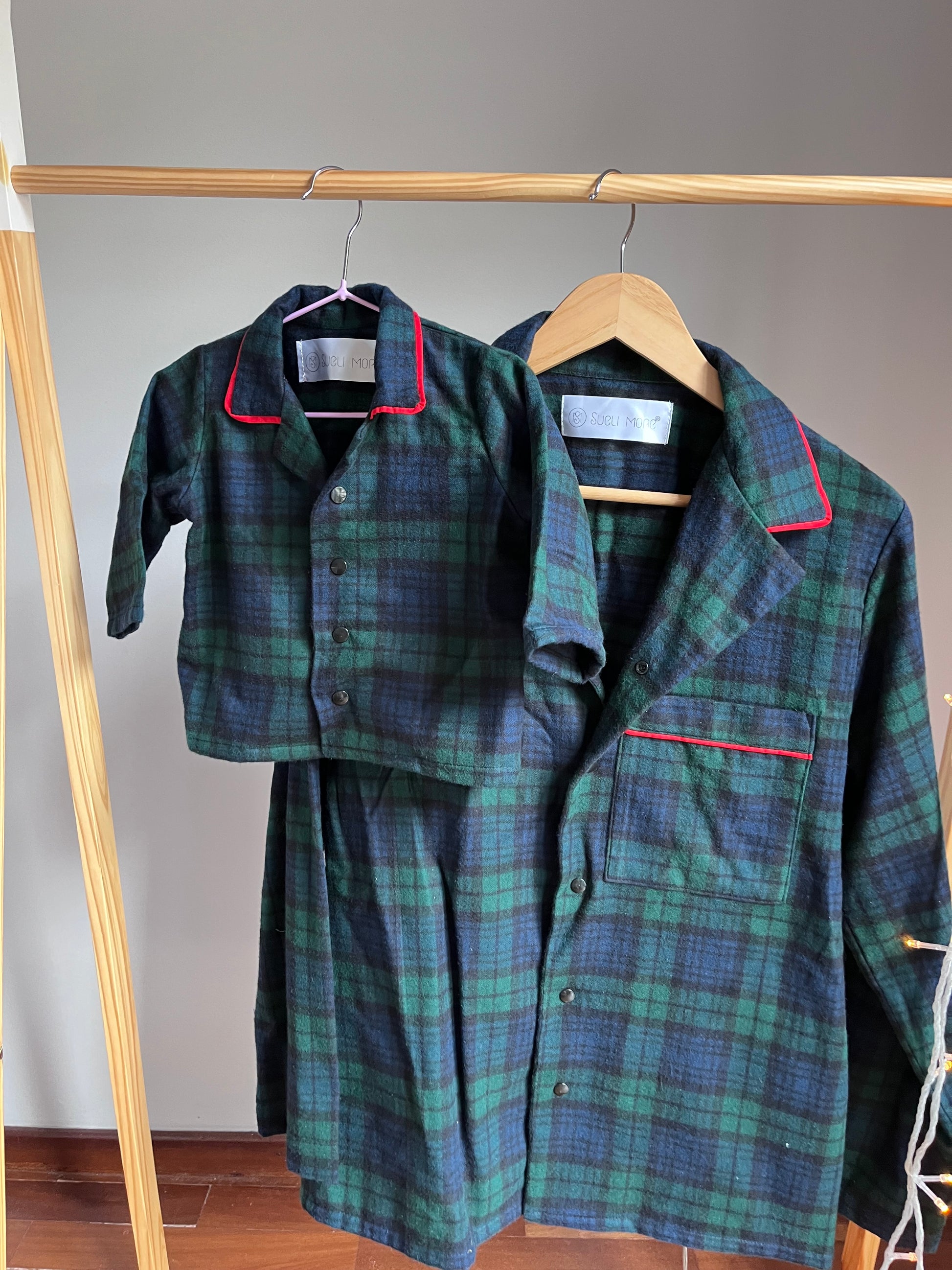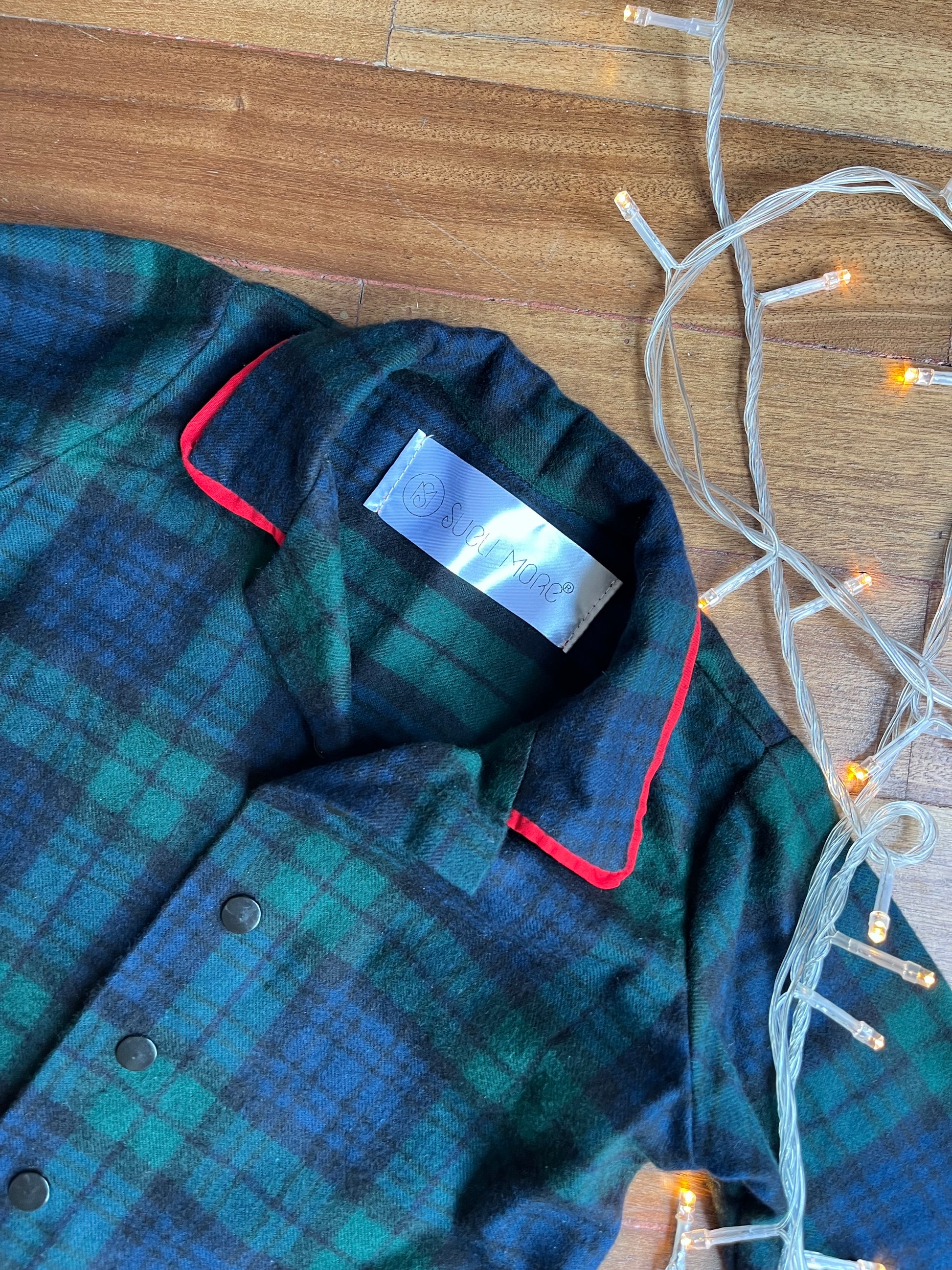 Pijama de flanela com padrão xadrez e vivo vermelho na gola, fecha com molas. Unissexo