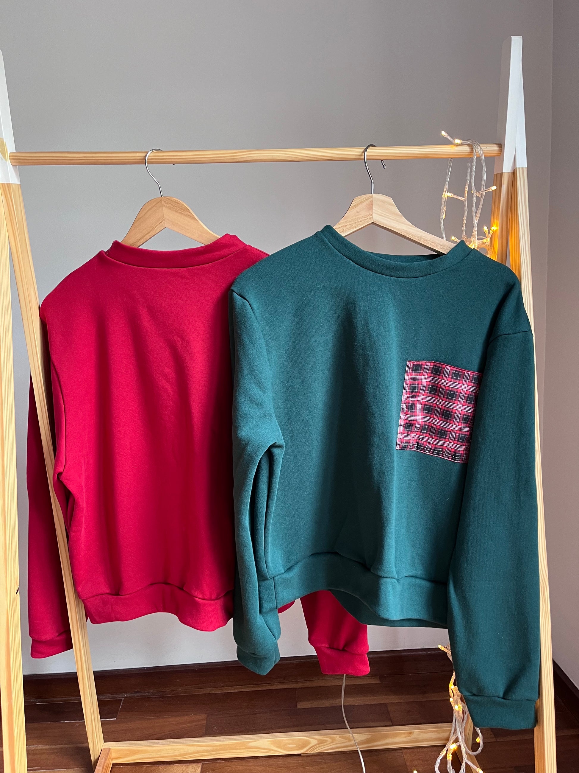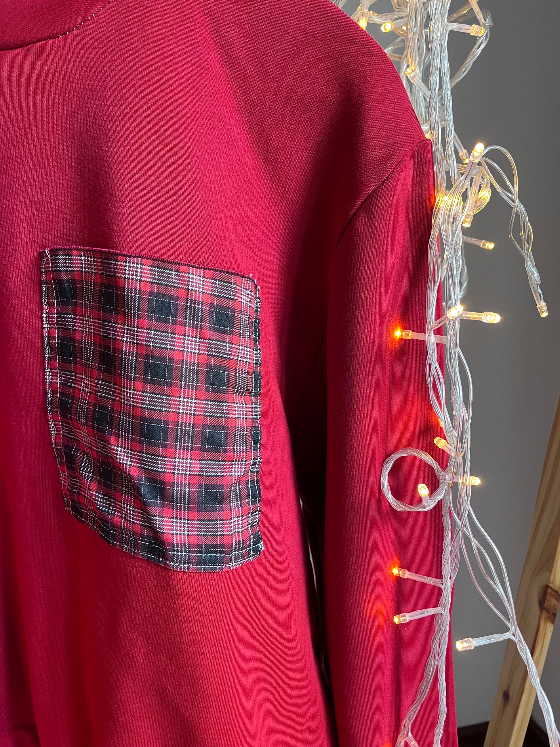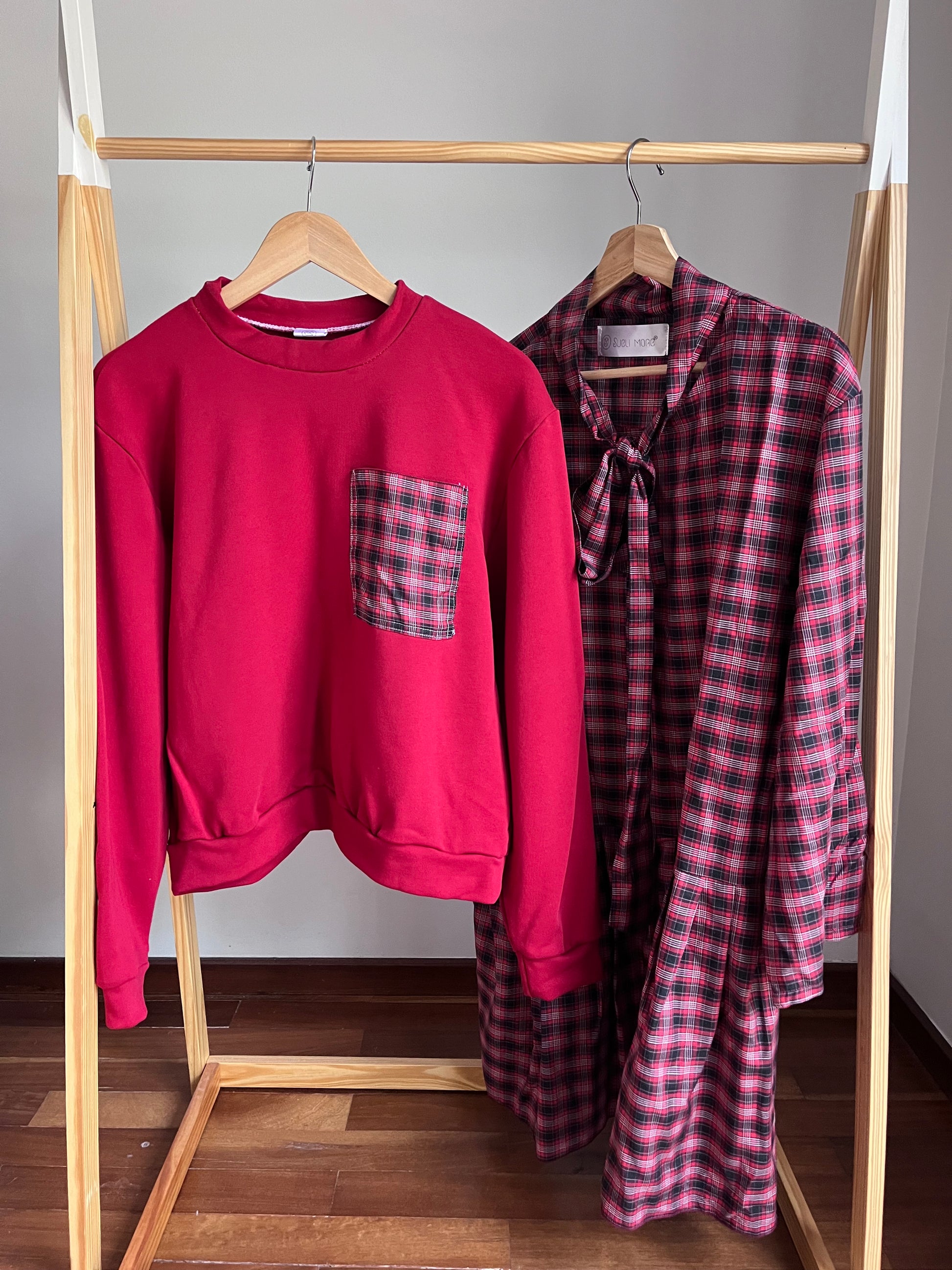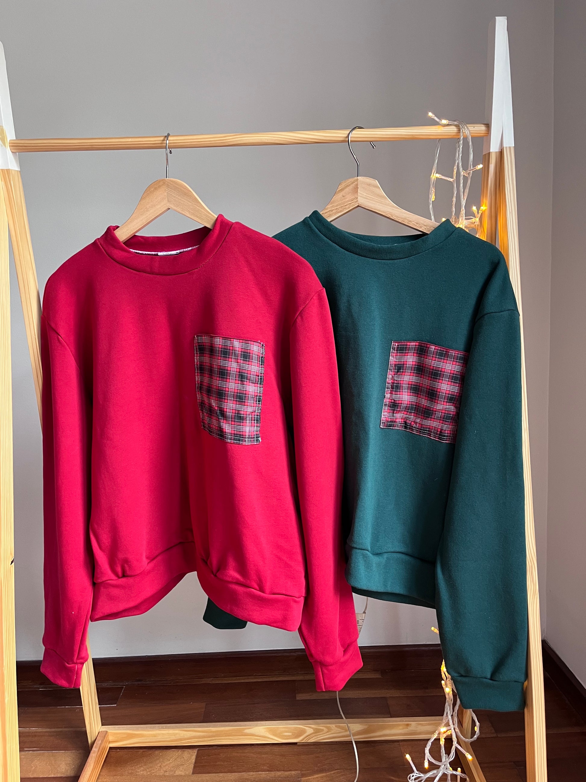 Sweat em malha cardada e bolso xadrez. Unisexo