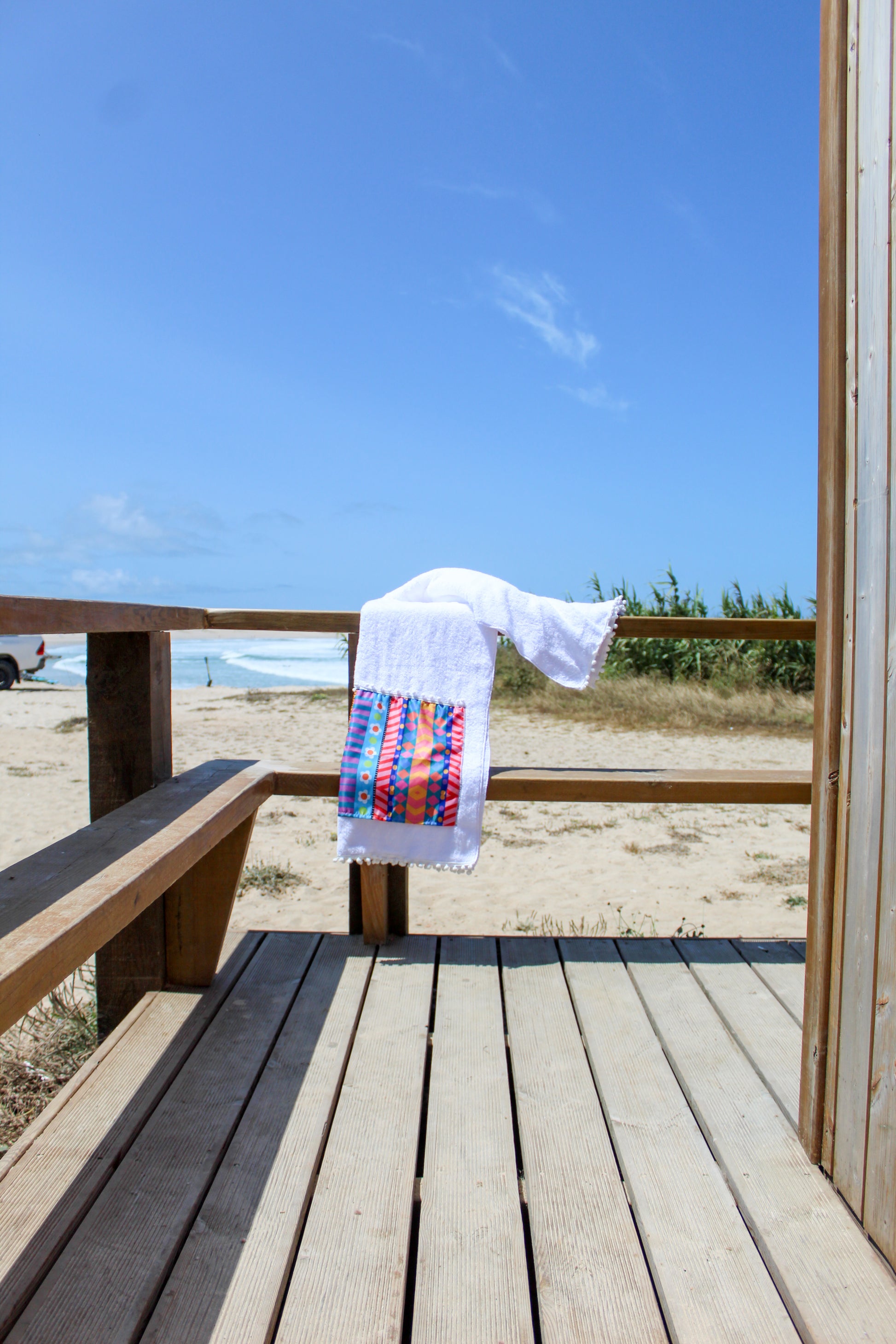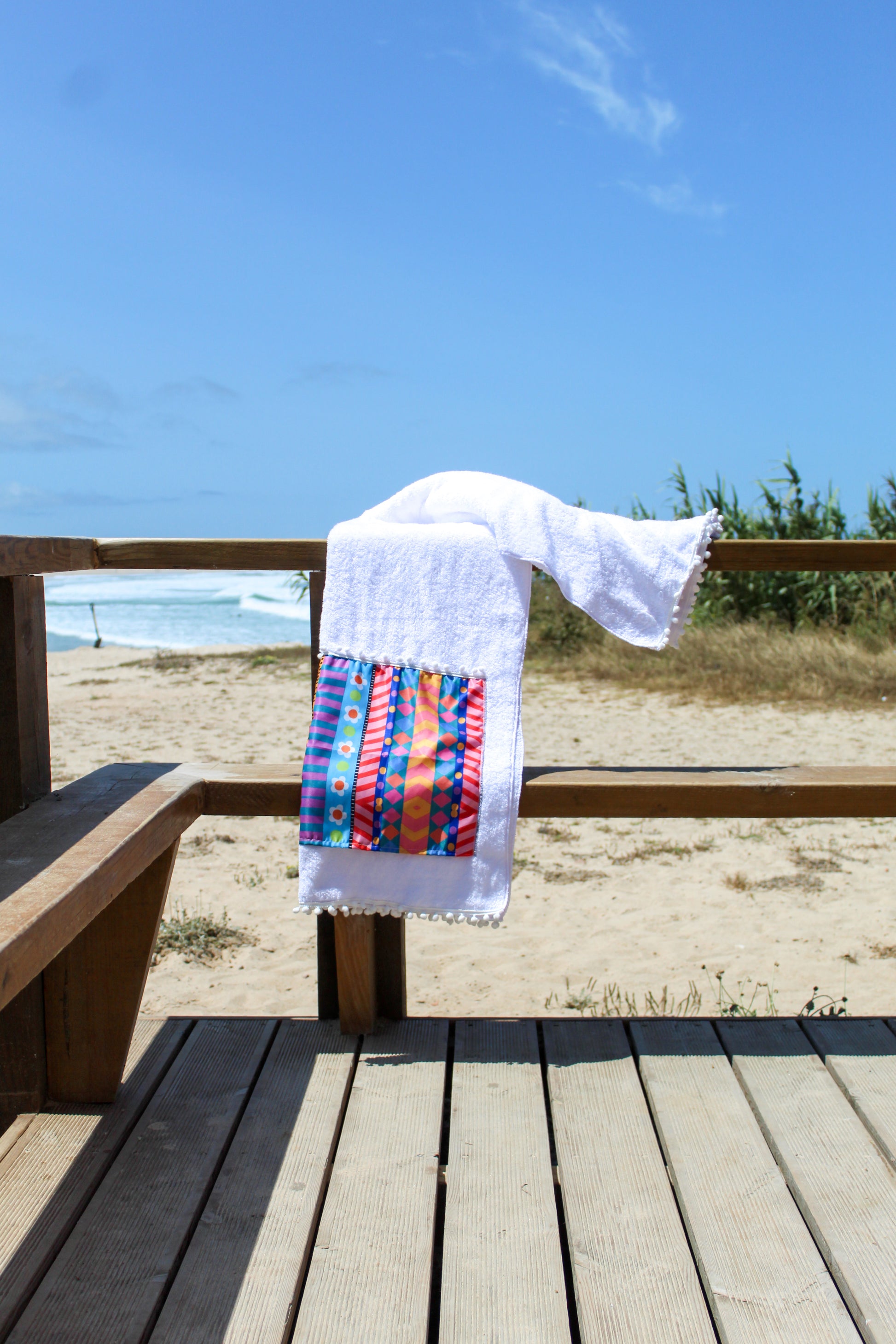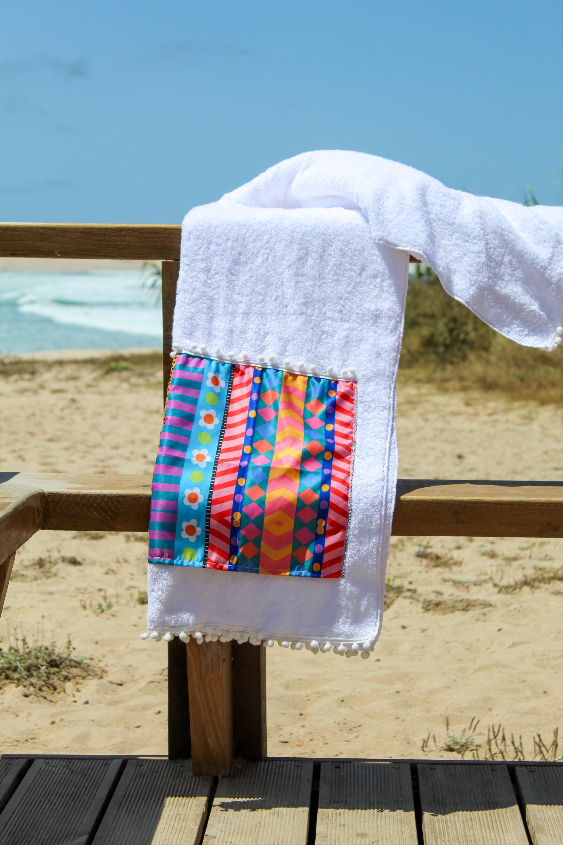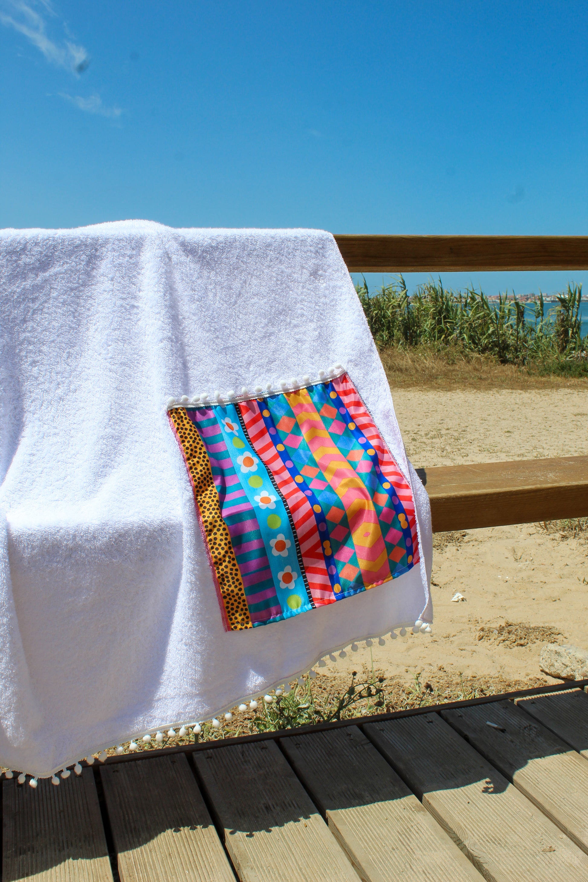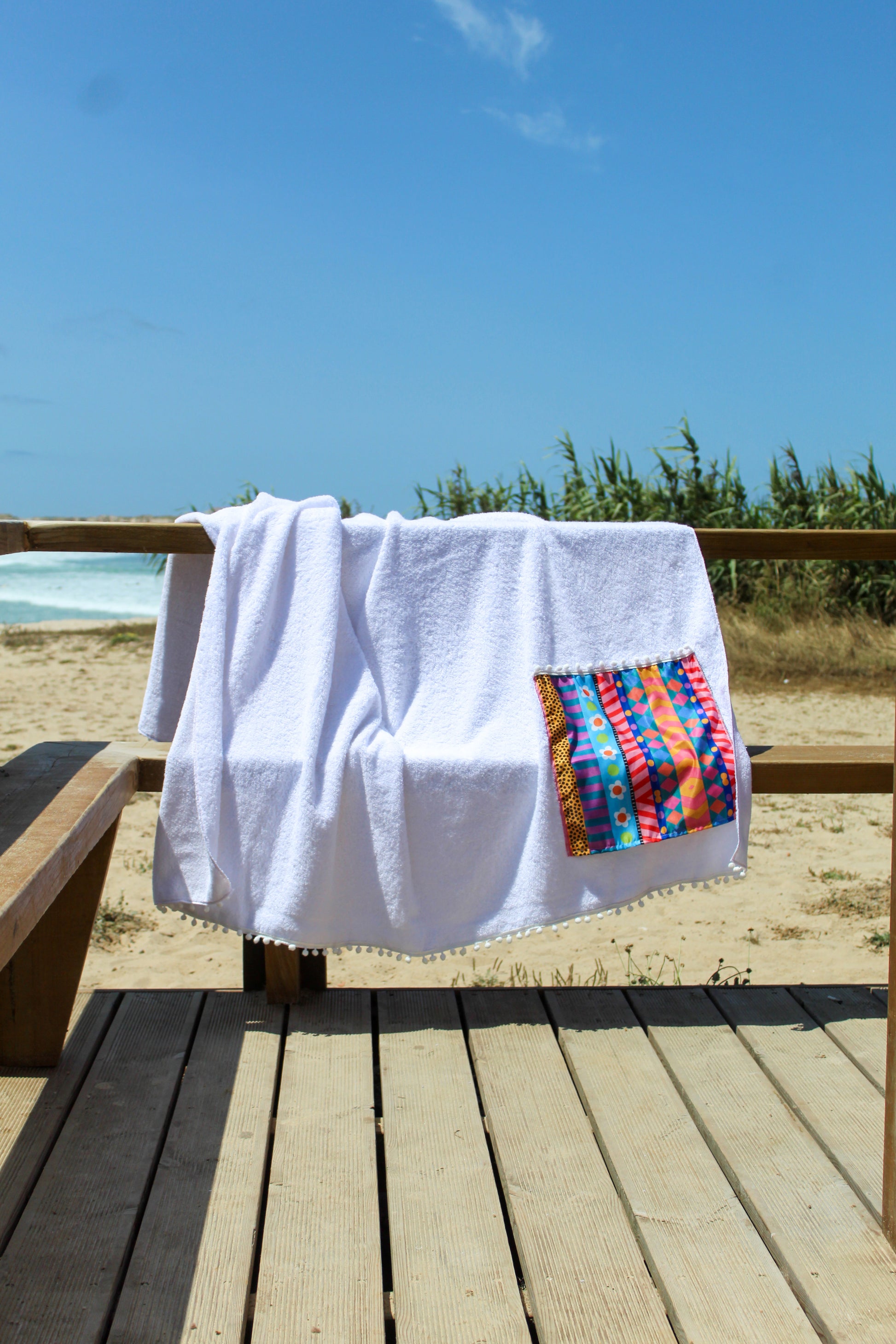 Toalha de praia em turco branco de alta qualidade e bolso em tactel com padrão à escolha, acabamento com bolinhas de algodão. Duas opções de tamanho, individual 0,75cm x 150cm ou familiar 150cm x150cm