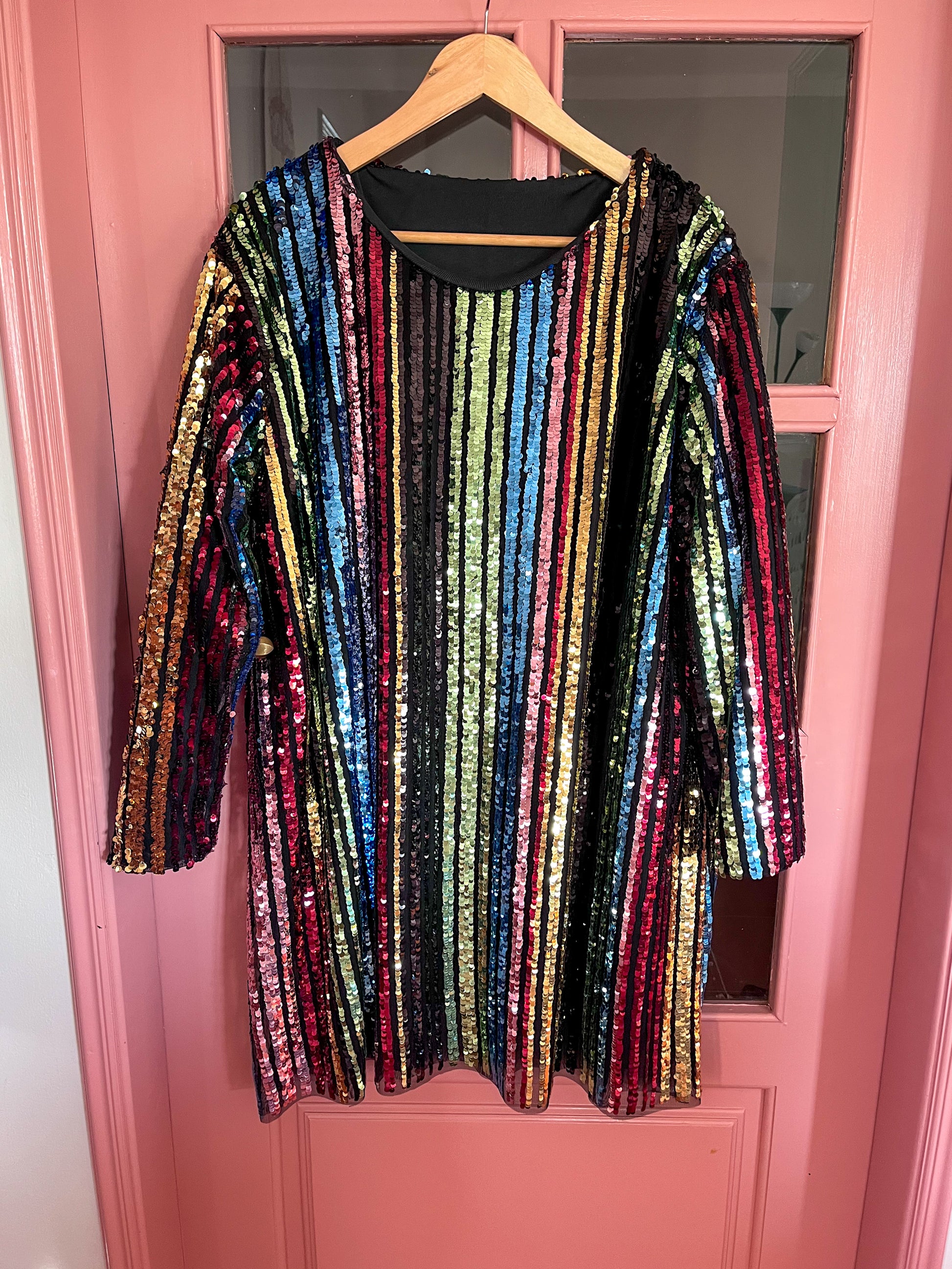 Vestido curto e corte largo de manga comprida, tecido em tule com riscas em lantejoulas multi-coloridas, interior forrado
